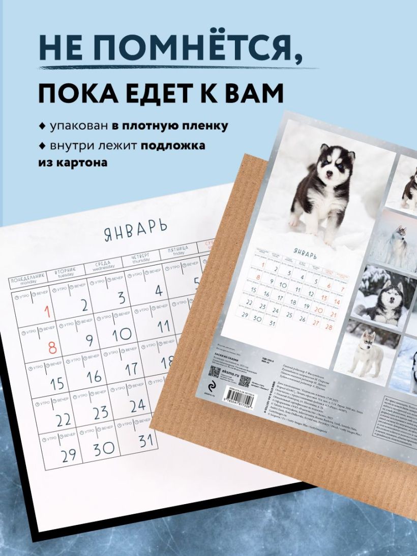 Календарь с милыми и забавными фотографиями собак породы хаски. Внутри вы найдете удобный трекер прогулок с питомцем.