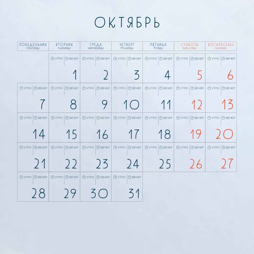 - Календарная сетка — с разбивкой по месяцам.