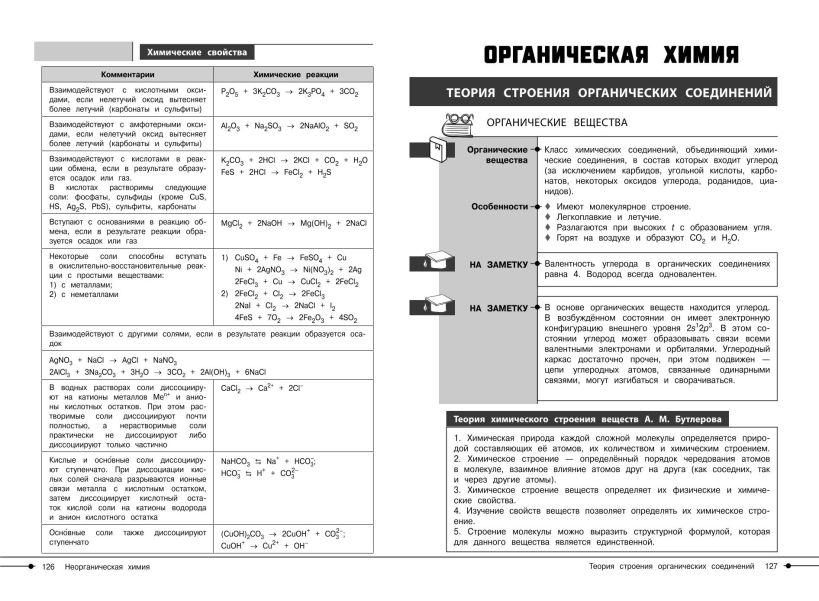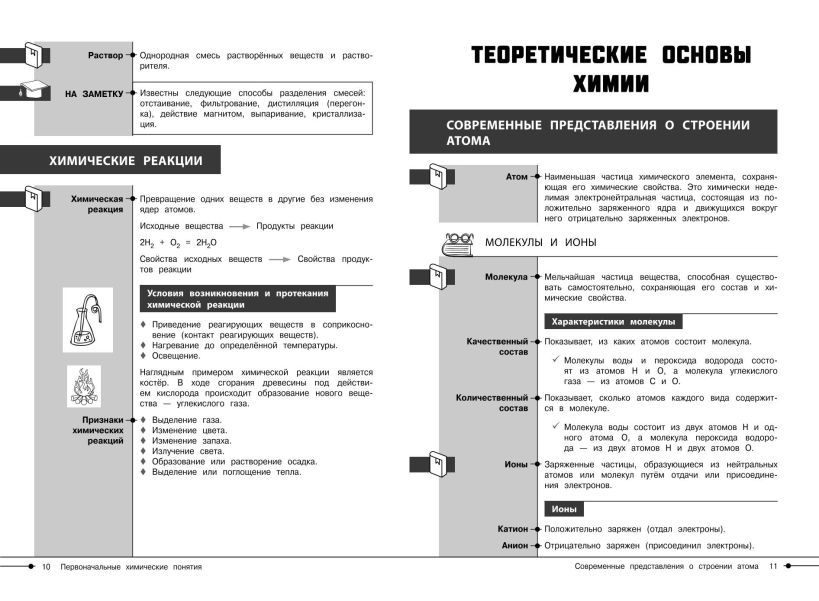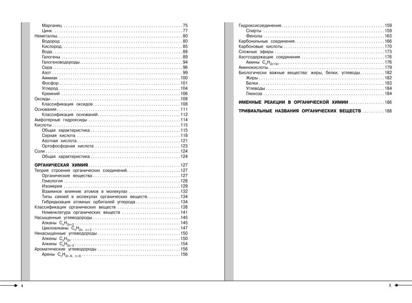 Справочник содержит важные материалы, которые помогут даже в сжатые сроки подготовиться к урокам, ОГЭ и ЕГЭ по химии. Теория школьного курса изложена в наглядной форме и дополняется блоком практических заданий c ответами для комплексного закрепления знаний. Информация представлена в максимально удобной и эффективной для изучения и запоминания форме — в схемах и таблицах, что обеспечит плодотворную и быструю подготовку к урокам, контрольным и различным экзаменам. В пособии можно найти все основные разделы предмета: «Теоретические основы химии», «Неорганическая химия», «Органическая химия», «Методы познания в химии», «Химия и жизнь», «Расчеты по химическим формулам и уравнениям реакций». В справочнике ученики 8-9-10-11 классов найдут много полезного для своего образования. Книжка станет незаменимым помощником для всех, кто хочет подтянуть свои знания или вспомнить уже изученные темы, подготовиться к урокам и экзаменам, а также будет прекрасным дополнением к учебнику и просто облегчит процесс учебы. Справочник будет полезен и для занятий родителей с детьми.