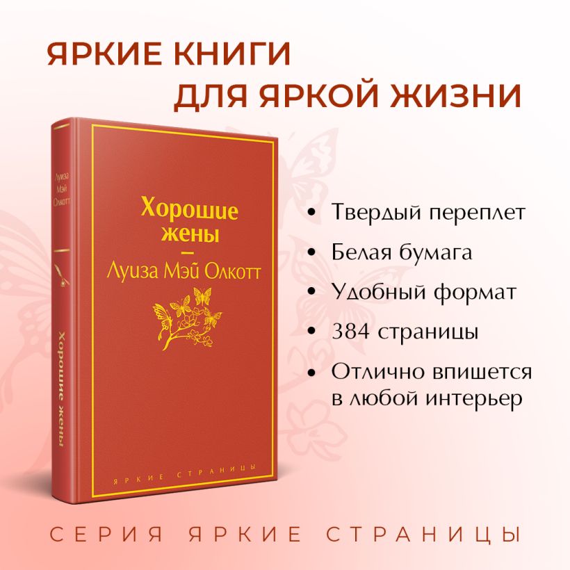 "Хорошие жены" - продолжение "Маленьких женщин", искреннего и трогательного романа о детстве и юности четырех сестер. Маргарет, Джо, Бесс и Эми такие разные, такие неповторимые. Они сообща справляются с трудностями, испытывают горести и радости, мечтают о будущем и проходят непростой путь взросления. А уже став взрослыми девушками, сталкиваются с новыми заботами. Живо и увлекательно описывая их судьбу, Олкотт снова вселяет веру в людей и человеческие чувства.