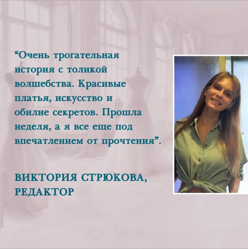 Долгие годы семья Солин Руссель держала в Париже салон свадебных платьев, где творилось настоящее волшебство. Невесту, надевшую платье от Руссель, ждало счастливое будущее????. Но Вторая мировая война перевернула жизнь Солин.Потеряв мать, дом и веру в любовь, она спрятала свои воспоминания и разбитые мечты в коробку и отправилась в путешествие через океан. В неизвестность...