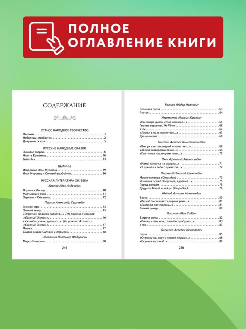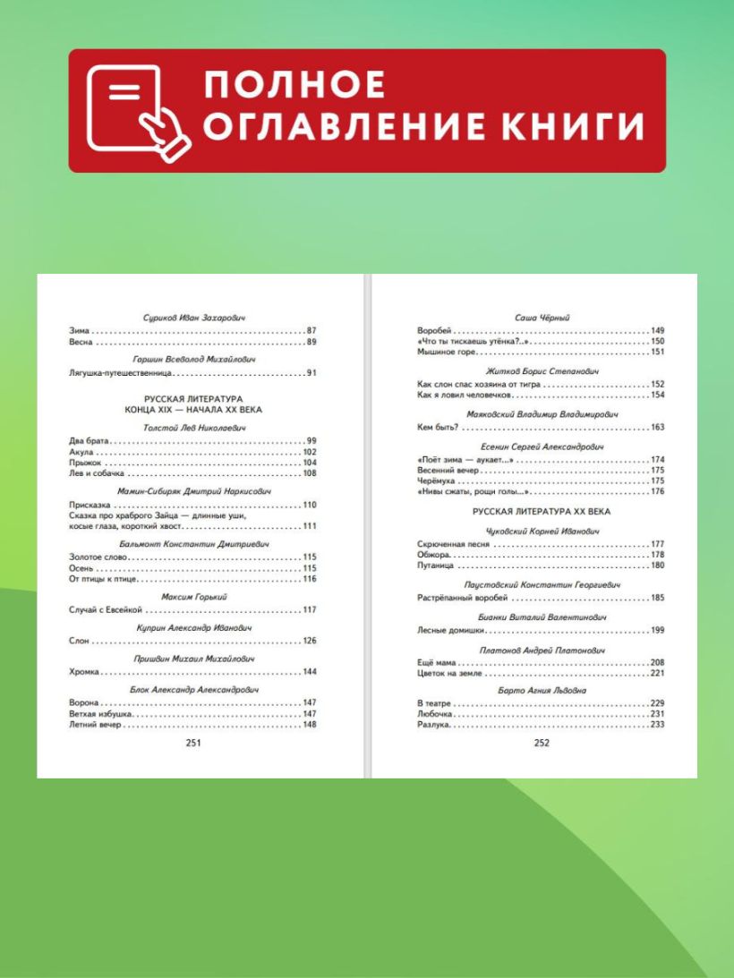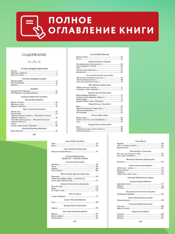 Прозаические произведения представлены также рассказами и сказками В. Одоевского, В. Гаршина, Л. Толстого, Д. Мамина-Сибиряка, М. Горького, А. Куприна, М. Пришвина, Н. Сладкова. В поэтический раздел включены басни И. А. Крылова, стихотворения А. С. Пушкина, М. Ю. Лермонтова, А. К. Толстого, А. А. Фета, Ф. И. Тютчева, Н. Н. Некрасова, А. Н. Плещеева, И. З. Сурикова, А. Н. Майкова, И. С. Никитина, К. Д. Бальмонта, С. Чёрного, С. А. Есенина, А. А. Блока, В. В. Маяковского, К. И Чуковского, А. Л. Барто.