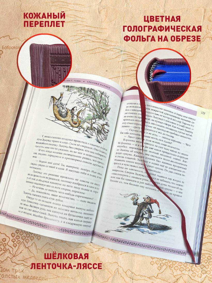 Легендарный цикл Клайва Стейплза Льюиса о фантастическом мире Нарнии принёс своему автору мировую славу. Общий тираж свыше 100 миллионов экземпляров, переводы почти на полусотню языков, многочисленные экранизации, теле- и радиопостановки, спектакли, мюзиклы, компьютерные игры снова и снова подтверждают неослабевающую популярность «Хроник Нарнии». Роскошное подарочное издание в кожаном переплёте и глянцевом полусупере с тиснением фольгой. Шёлковая ленточка-ляссе. Цветная голографическая фольга на обрезе. Мелованная бумага. Полноцветные классические иллюстрации. Чёткий шрифт.