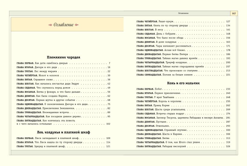 Все семь повестей цикла в одной книге: «Племянник чародея», «Лев, колдунья и платяной шкаф», «Конь и его мальчик», «Принц Каспиан», «"Покоритель зари", или Плавание на край света» и другие.