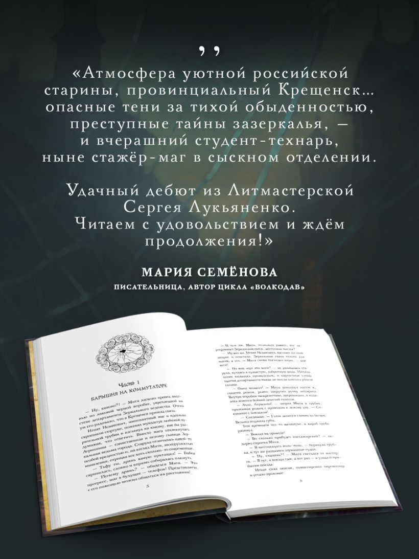 «Атмосфера уютной российской старины, провинциальный Крещенск… опасные тени за тихой обыденностью, преступные тайны зазеркалья, — и вчерашний студент-технарь, ныне стажёр-маг в сыскном отделении. Удачный дебют из Литмастерской Сергея Лукьяненко. Читаем с удовольствием и ждём продолжения!» — Мария Семёнова, писательница, автор цикла «Волкодав»