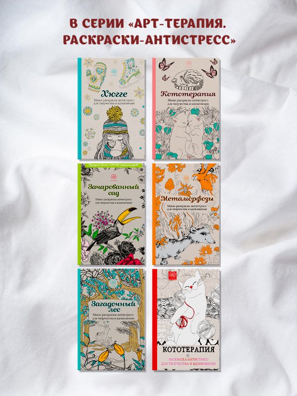 Серия «Арт-терапия» - это множество причудливых узоров и фантастических рисунков, которые подарят вам спокойствие и умиротворение и помогут избавиться от стресса. Возьмите цветные карандаши или ручки и полностью отключитесь от внешнего мира, раскрашивая очаровательных котиков, пледы и чашечки с кофе, и через некоторое время вы вернетесь уже полностью обновленным человеком.