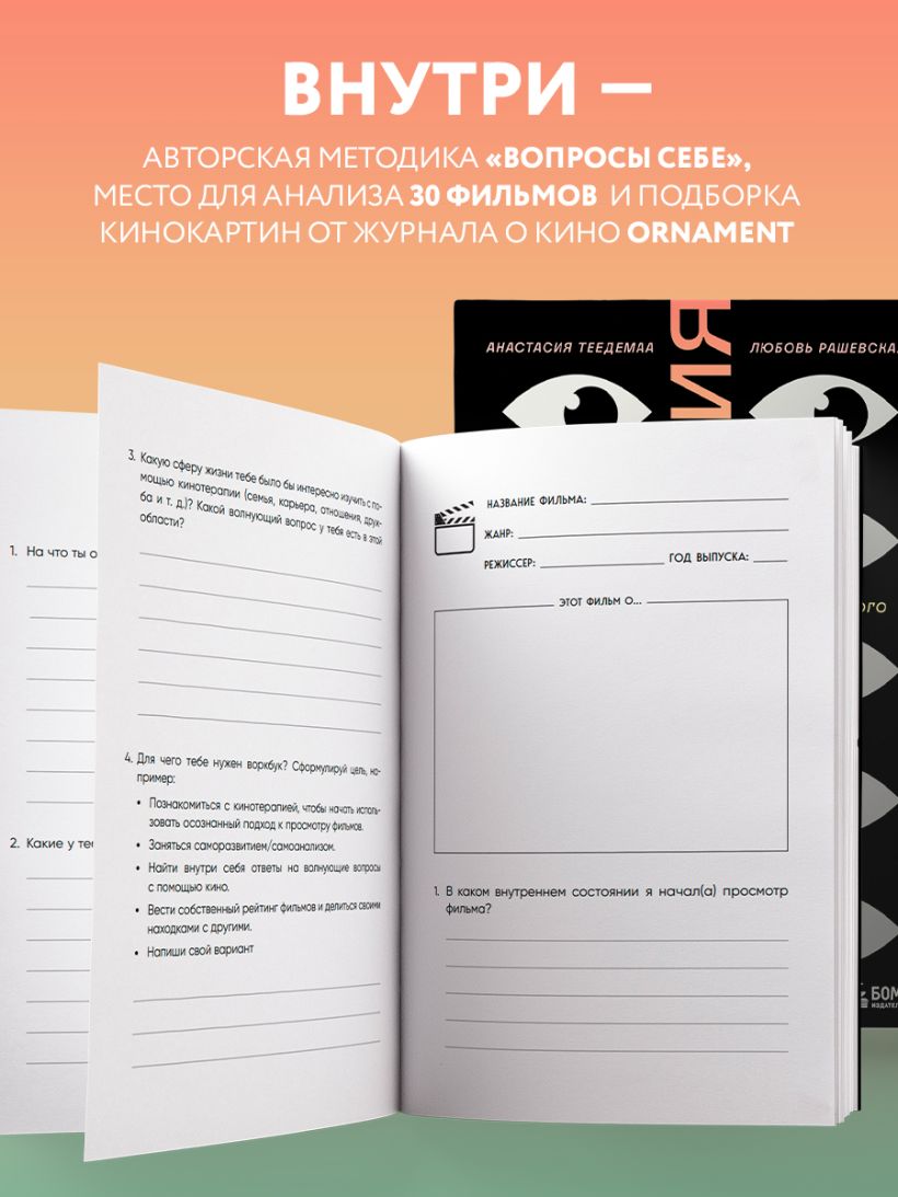 Внутри вы найдете авторскую методику «вопросы себе», место для анализа 30 фильмов и подборку кинокартин от журнала о кино ORNAMENT, от преподавателя ВГИКа И Московской школы кино, от онлайн-кинотеатра OKKO.