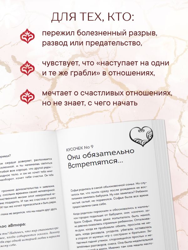Светлана Патрушева рассказывает, как настроить способность любить и быть любимой, пережить расставание, преодолеть деструктивные любовные сценарии и понять, что любовь к партнеру начинается с любви к себе. В книге нет привычных глав, а есть «кусочки», которые собираются во что-то прекрасное и целое. Склеить сердце помогут авторские практики и инструменты, а также реальные истории, над которыми захочется посмеяться или поплакать.