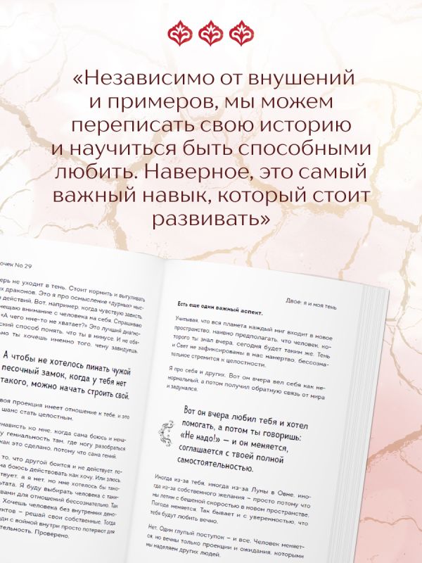 «Эта книга раскрывает все стороны и грани любви, помогая через истории разных людей познать себя и помочь полюбить. Спасибо автору за честные ответы, за легкую форму и глубокое погружение в красоту и подлинность любви. Пусть книга окажется у каждой женщины. И тогда, я уверена, несчастных глаз, разбитых сердец, боли и разочарований будет значительно меньше. А будет самое важное — ясность, спокойствие, доверие себе и жизни». — Юлия Булгакова, психолог, коуч и автор бестселлера «Разреши себе чувствовать»