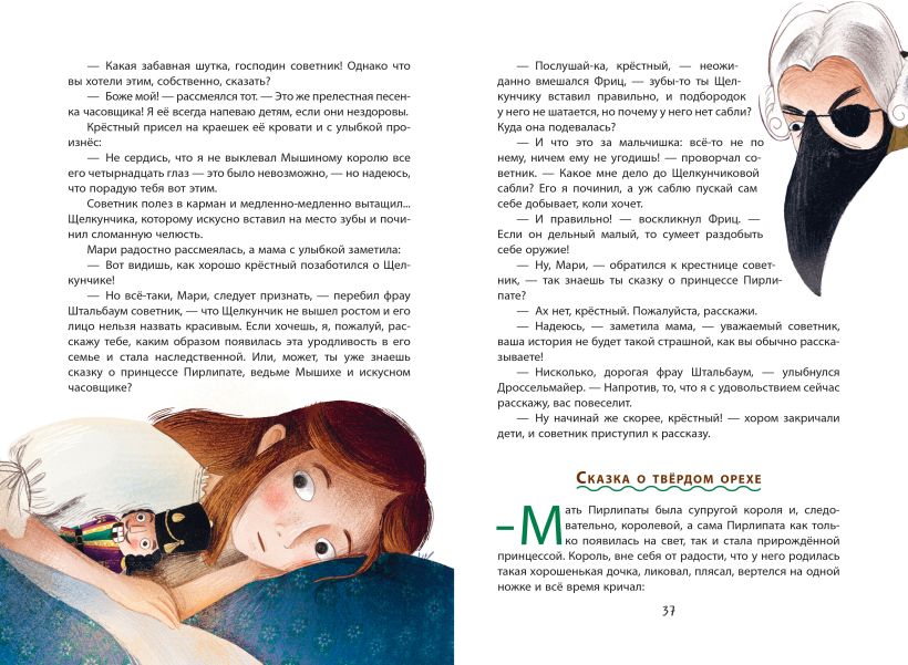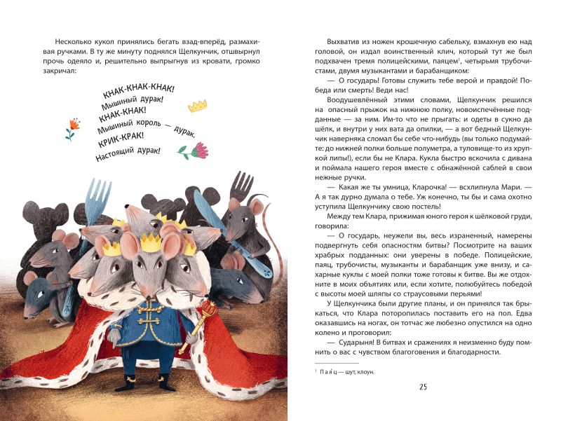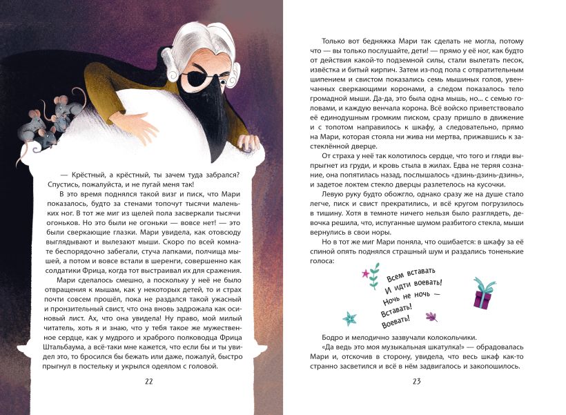 «Щелкунчик и Мышиный король» — одна из самых новогодних сказок, интересная мальчикам и девочкам, любимая взрослыми и детьми. Действие сказки разворачивается волшебными снежными вечерами, когда девочка Мари получает диковинный подарок, защищается от Мышиного короля и попадает в необыкновенное сладкое королевство. Романтические образы, встречающиеся на каждом развороте, пробуждают фантазию ребёнка, а переживания героев способствуют эмоциональному развитию.