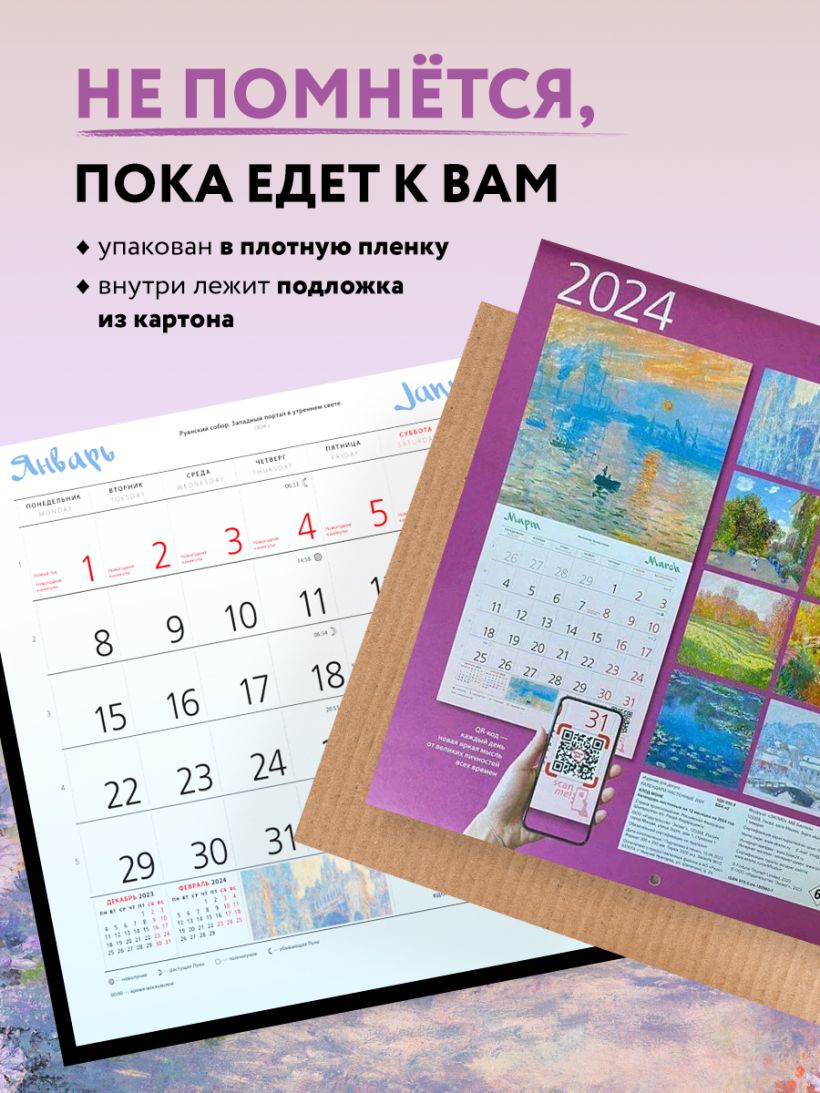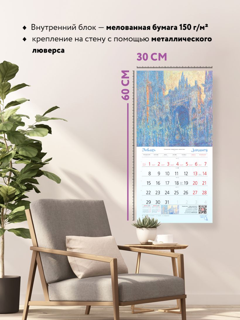 Практичный и эстетичный, этот календарь каждый месяц будет радовать вас. Прекрасные картины органично дополнят любой интерьер и помогут планировать время. В этом календаре представлены шедевры кисти Клода Моне.