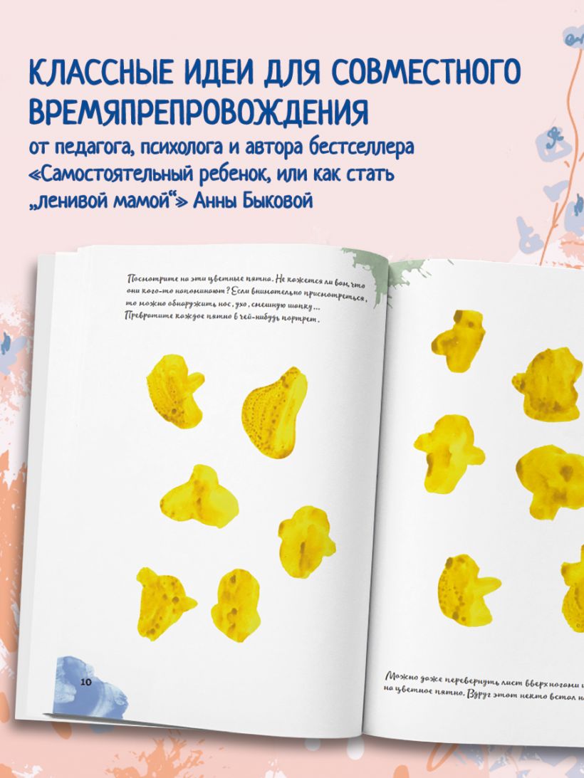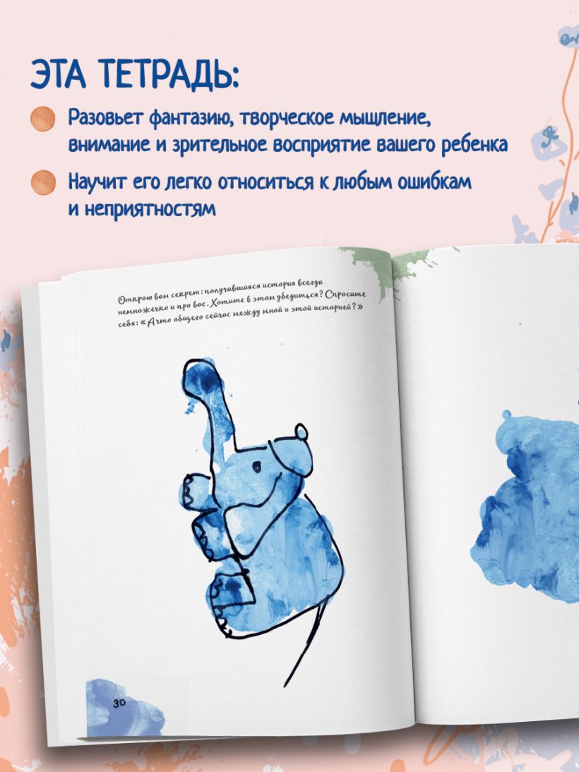 Дорогие родители! Эту развивающую тетрадь разработала педагог, психолог и автор бестселлера "Самостоятельный ребёнок, или Как стать "ленивой мамой"" Анна Быкова. Еще в детстве она полюбила одну игру: закапать краской лист бумаги, а потом вертеть его, придумывать, на что это похоже, дорисовывая кляксы до красивой картинки. Таким образом получается замечательная коррекция страха ошибки. Любые ляпы можно дорисовать, переделать, использовать для нового рисунка.