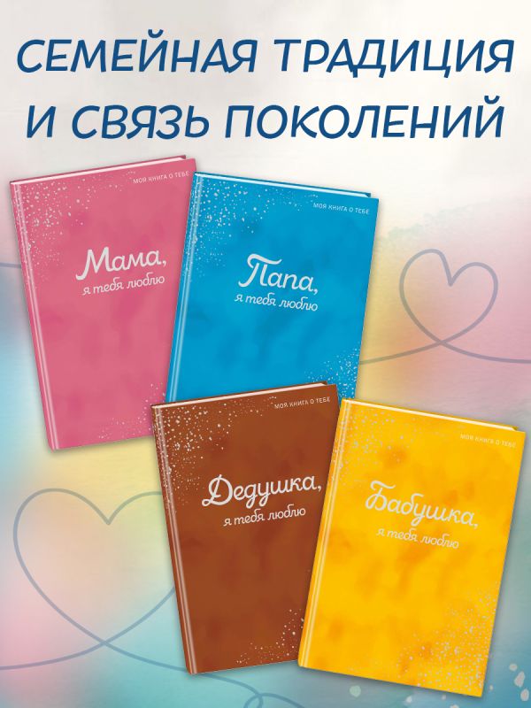 Такие же книги мы сделали для мамы, бабушки и дедушки – «Мама, я тебя люблю! Моя книга о тебе», «Бабушка, я тебя люблю! Моя книга о тебе», «Дедушка, я тебя люблю! Моя книга о тебе». Комплект книг этой серии прекрасно дополнит вашу домашнюю библиотеку.