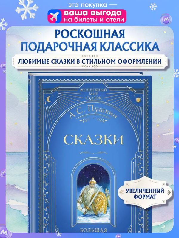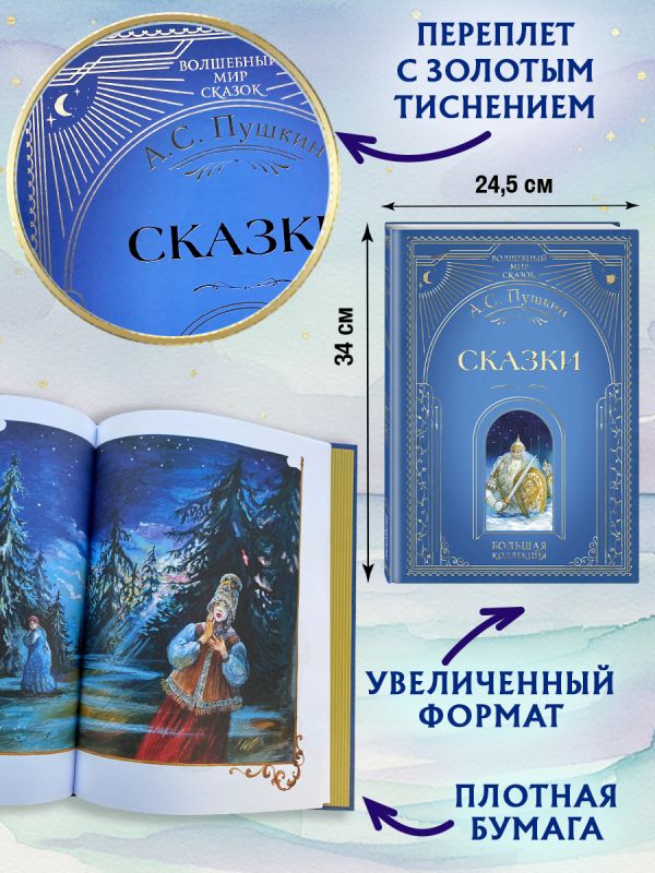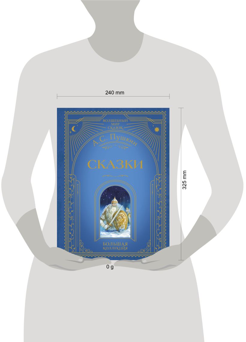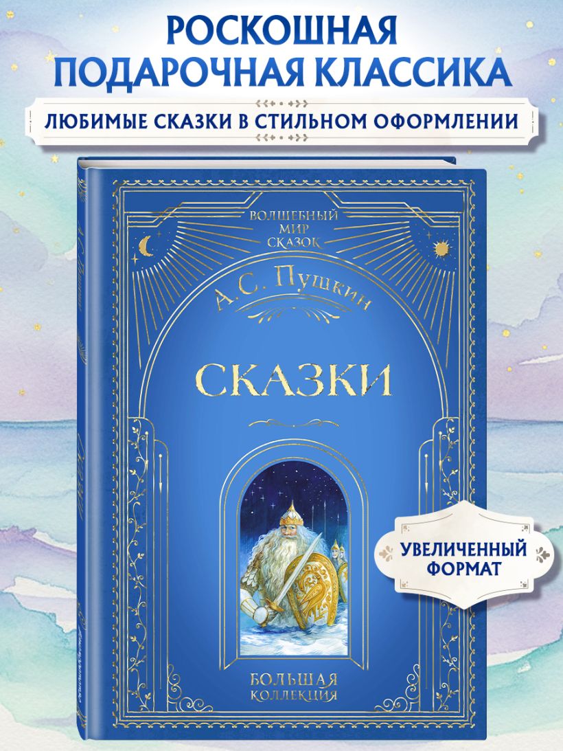 ВЕЛИКОЛЕПНОЕ ПОДАРОЧНОЕ ИЗДАНИЕ В ИЗЫСКАННОМ И СТИЛЬНОМ ОФОРМЛЕНИИ! Книга большого формата (24х32,5 см). Твёрдый переплёт с золотым тиснением и частичным лаком. Цветные форзацы. Плотная бумага. Чёткий, удобный для чтения шрифт. Красочные иллюстрации. Книги серии «Волшебный мир сказок. Большая коллекция» — это приглашение в удивительное путешествие по таинственным мирам, ставшим зримыми и осязаемыми благодаря искусству художников. Лучшие мастера книжной иллюстрации подарят вам незабываемые впечатления от встречи со сказкой. На мистических и прекрасных просторах Древней Руси разворачивается действие знаменитой пушкинской поэмы «Руслан и Людмила». Погрузиться в незабываемую атмосферу читателям помогут изысканные, стилистически точные, красочные иллюстрации известной московской художницы Анны Власовой. С незапамятных времён люди придумывали необыкновенные страны, населяли их чудесными существами и рассказывали диковинные истории об удивительных событиях, происходивших «в некотором царстве, в некотором государстве». Так появились сказки, без которых сегодня мы не можем представить детство. Волшебные или очень похожие на правду, страшные или смешные, народные или литературные — все они увлекали слушателей своей необычностью, загадочностью, передавали от предков и закладывали в сердца бесценные сокровища: вековую мудрость, понимание добра и зла, неписаные правила жизни, — и так формировали уникальный культурный код наций и народов.