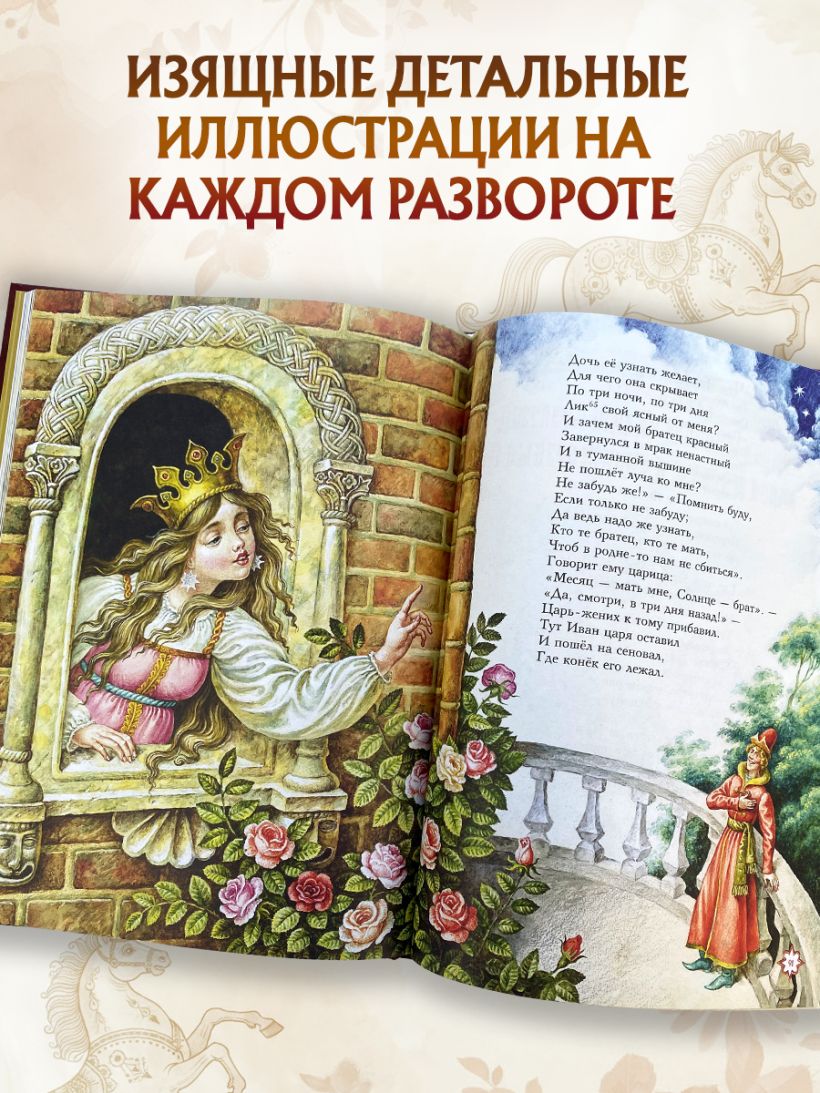 ВЕЛИКОЛЕПНОЕ ПОДАРОЧНОЕ ИЗДАНИЕ В ИЗЫСКАННОМ И СТИЛЬНОМ ОФОРМЛЕНИИ! Книга большого формата (24х32,5 см). Твёрдый переплёт с золотым тиснением и частичным лаком. Цветные форзацы. Плотная бумага. Чёткий, удобный для чтения шрифт. Красочные иллюстрации. Книги серии «Волшебный мир сказок. Большая коллекция» — это приглашение в удивительное путешествие по таинственным мирам, ставшим зримыми и осязаемыми благодаря искусству художников. Лучшие мастера книжной иллюстрации подарят вам незабываемые впечатления от встречи со сказкой. Великолепной чередой выходят на страницы этой книги любимейшие герои прекрасных пушкинских сказок: отважный князь Гвидон и прекрасная Царевна Лебедь, могущественная золотая рыбка и преданный королевич Елисей, хитроумный Балда и коварная Шамаханская царица. Насладиться чарующей, волшебной атмосферой читателям помогут изящные, яркие иллюстрации московской художницы Анны Власовой. С незапамятных времён люди придумывали необыкновенные страны, населяли их чудесными существами и рассказывали диковинные истории об удивительных событиях, происходивших «в некотором царстве, в некотором государстве». Так появились сказки, без которых сегодня мы не можем представить детство. Волшебные или очень похожие на правду, страшные или смешные, народные или литературные — все они увлекали слушателей своей необычностью, загадочностью, передавали от предков и закладывали в сердца бесценные сокровища: вековую мудрость, понимание добра и зла, неписаные правила жизни, — и так формировали уникальный культурный код наций и народов.
