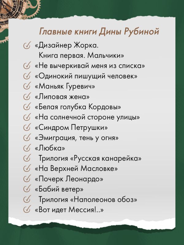 Дина Рубина — современный прозаик, лауреат российской премии «Большая книга». Ее романы и рассказы не раз были экранизированы.