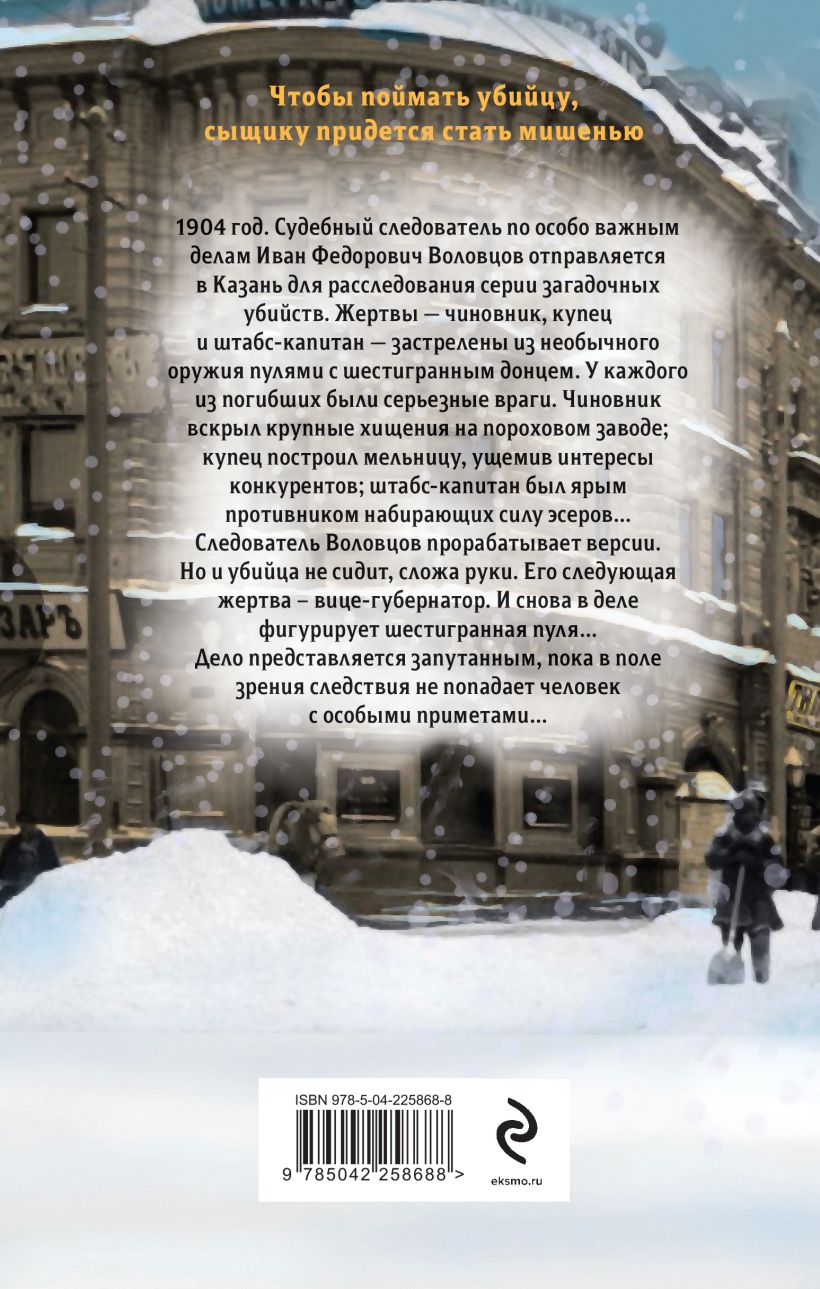 1904 год. Судебный следователь по особо важным делам Иван Федорович Воловцов отправляется в Казань для расследования серии загадочных убийств. Жертвы — чиновник, купец и штабс-капитан — застрелены из необычного оружия пулями с шестигранным донцем. У каждого из погибших были серьезные враги. Чиновник вскрыл крупные хищения на пороховом заводе; купец построил мельницу, ущемив интересы конкурентов; штабс-капитан был ярым противником набирающих силу эсеров… Следователь Воловцов прорабатывает версии. Но и убийца не сидит сложа руки. Его следующая жертва — вице-губернатор. И снова в деле фигурирует шестигранная пуля… Дело представляется запутанным, пока в поле зрения следствия не попадает человек с особыми приметами…