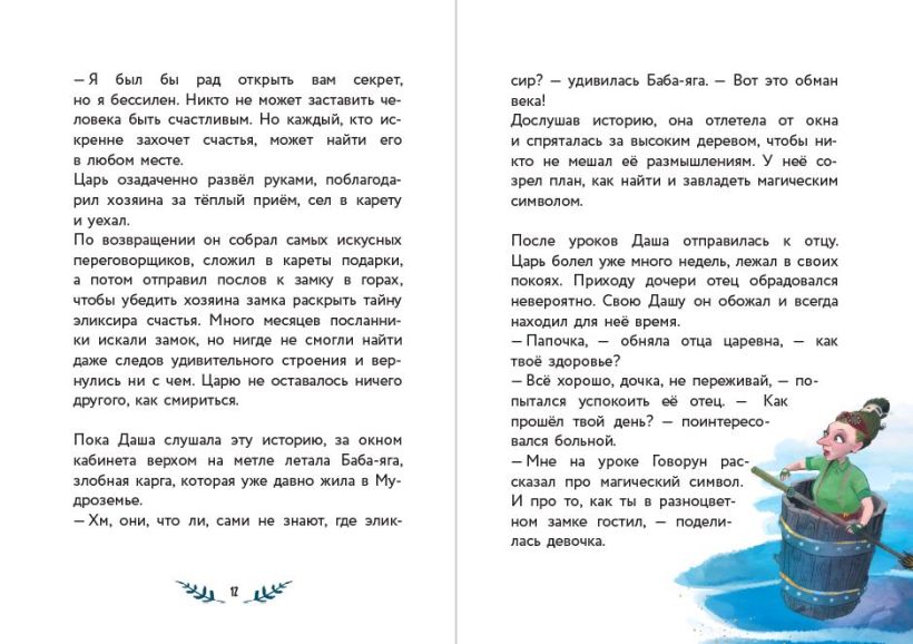 Хочешь узнать ещё больше о приключениях царевны Даши? Тогда открывай эту книгу — в ней девочке предстоит отправиться в дальнюю дорогу, полную опасностей, чтобы добыть эликсир счастья и вылечить правителя Мудроземья. В компании своего учителя Говоруна Даша преодолеет любые препятствия!
