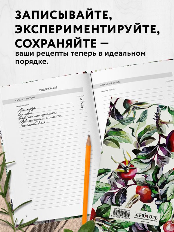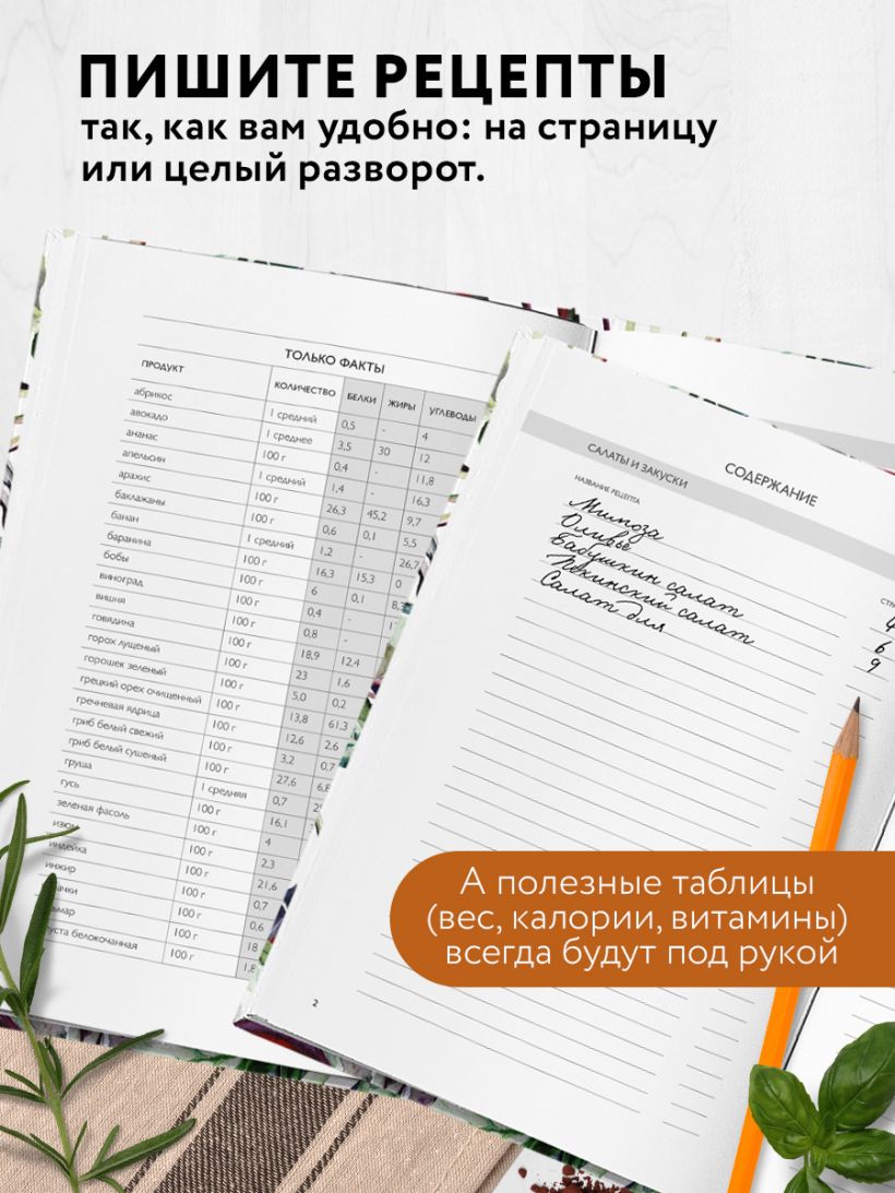 Придумывай! Готовь! Записывай! Устали хранить свои любимые рецепты на клочках бумаги?! Эта яркая книга для записи кулинарных рецептов всегда под рукой. Каждый раз, открывая ее, вы будете ловить себя на мысли: какая же она удобная и симпатичная. Мы продумали каждую мелочь. Теперь не важно, сколько среди ваших рецептов салатов и закусок, горячих блюд, супов, выпечки и десертов или заготовок — именно такие разделы есть в книге, — вы сами можете составить удобное вам содержание. На каждый раздел в нем отведена страница. Маленький или большой рецепт? Здесь тоже все удобно — чередуются рецепты на страницу и рецепты на разворот. Справочная информация — таблица веса основных продуктов в стандартных объемах, таблица калорийности продуктов, содержание важнейших витаминов в продуктах — теперь всегда под рукой. Готовьте с удовольствием свои любимые блюда из наших книг для записи кулинарных рецептов!