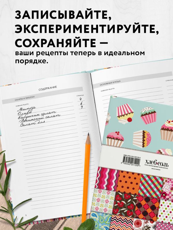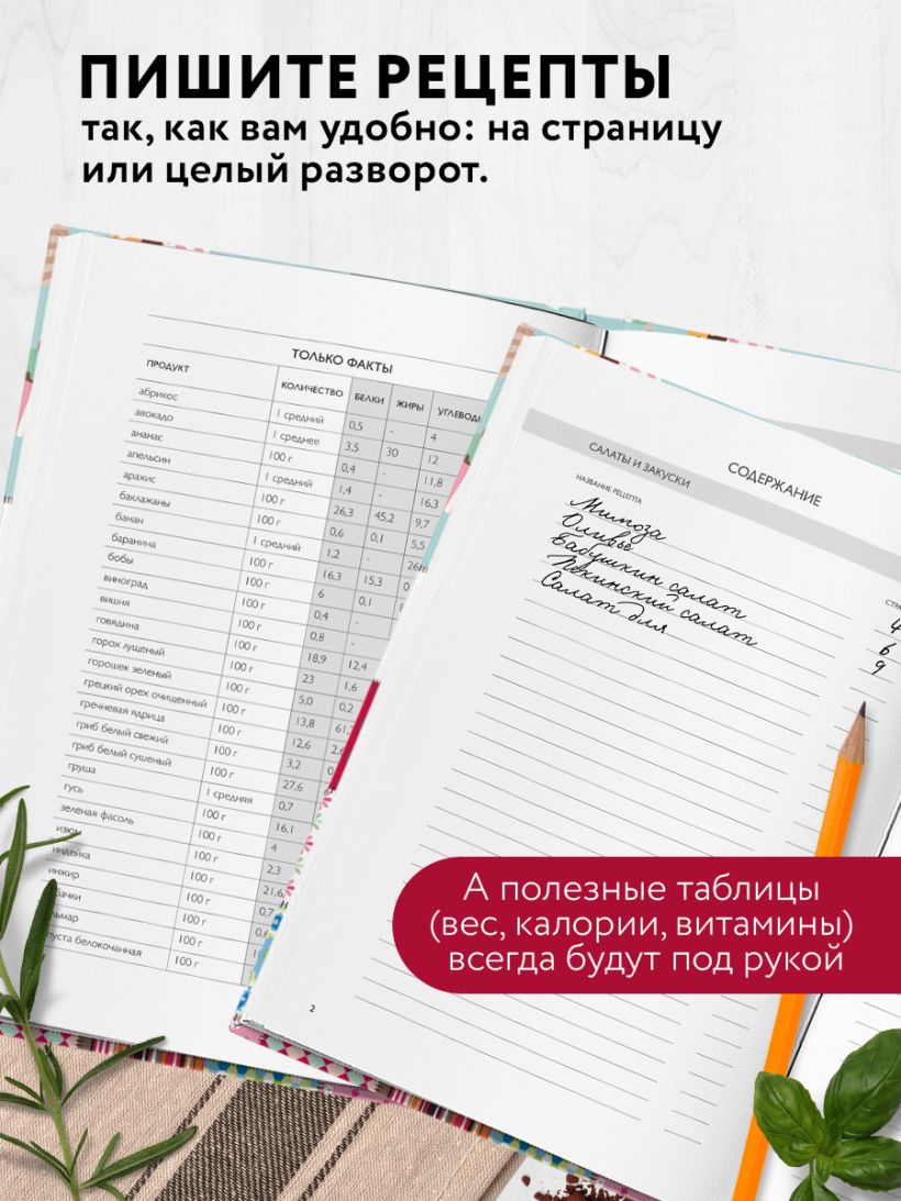 Придумывай! Готовь! Записывай! Устали хранить свои любимые рецепты на клочках бумаги?! Эта яркая книга для записи кулинарных рецептов всегда под рукой. Каждый раз, открывая ее, вы будете ловить себя на мысли: какая же она удобная и симпатичная. Мы продумали каждую мелочь. Теперь не важно, сколько среди ваших рецептов салатов и закусок, горячих блюд, супов, выпечки и десертов или заготовок — именно такие разделы есть в книге, — вы сами можете составить удобное вам содержание. На каждый раздел в нем отведена страница. Маленький или большой рецепт? Здесь тоже все удобно — чередуются рецепты на страницу и рецепты на разворот. Справочная информация — таблица веса основных продуктов в стандартных объемах, таблица калорийности продуктов, содержание важнейших витаминов в продуктах — теперь всегда под рукой. Готовьте с удовольствием свои любимые блюда из наших книг для записи кулинарных рецептов!