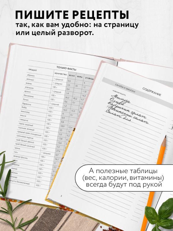 Придумывай! Готовь! Записывай! Устали хранить свои любимые рецепты на клочках бумаги?! Эта яркая книга для записи кулинарных рецептов всегда под рукой. Каждый раз, открывая ее, вы будете ловить себя на мысли: какая же она удобная и симпатичная. Мы продумали каждую мелочь. Теперь не важно, сколько среди ваших рецептов салатов и закусок, горячих блюд, супов, выпечки и десертов или заготовок — именно такие разделы есть в книге, — вы сами можете составить удобное вам содержание. На каждый раздел в нем отведена страница. Маленький или большой рецепт? Здесь тоже все удобно — чередуются рецепты на страницу и рецепты на разворот. Справочная информация — таблица веса основных продуктов в стандартных объемах, таблица калорийности продуктов, содержание важнейших витаминов в продуктах — теперь всегда под рукой. Готовьте с удовольствием свои любимые блюда из наших книг для записи кулинарных рецептов!