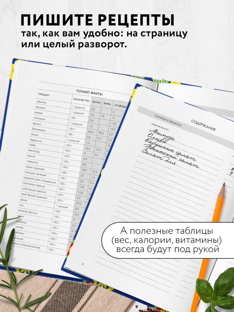 Придумывай! Готовь! Записывай! Устали хранить свои любимые рецепты на клочках бумаги?! Эта яркая книга для записи кулинарных рецептов всегда под рукой. Каждый раз, открывая ее, вы будете ловить себя на мысли: какая же она удобная и симпатичная. Мы продумали каждую мелочь. Теперь не важно, сколько среди ваших рецептов салатов и закусок, горячих блюд, супов, выпечки и десертов или заготовок — именно такие разделы есть в книге, — вы сами можете составить удобное вам содержание. На каждый раздел в нем отведена страница. Маленький или большой рецепт? Здесь тоже все удобно — чередуются рецепты на страницу и рецепты на разворот. Справочная информация — таблица веса основных продуктов в стандартных объемах, таблица калорийности продуктов, содержание важнейших витаминов в продуктах — теперь всегда под рукой.