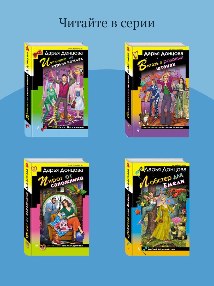 «Алиби для землеройки» Успех — это гора, на вершину которой ты забираешься весь в синяках. И тогда о тебе и вспоминают все, кто когда-то бросил и ушел, обозвав неудачником. В агентство Степана и Виолы обратился успешный бизнесмен и талантливый стилист Марк Иванов. Он хочет найти свою настоящую маму. Еще в детстве Марк был брошен родителями и вырос в детском доме, смирившись с мыслью, что никому не нужен. Однако недавно он получил таинственное письмо от матери, умершей в тюрьме. Оказывается, он вовсе не ее биологический ребенок, а был украден и подменен в роддоме. Чтобы раскрыть загадку происхождения Марка, Таракановой пришлось изрядно покопаться в клубке давних интриг: махинации врачей, сговор медсестер, жаждущие власти богачи и отчаянные попытки молодой женщины спасти свою семью. Наконец результат можно предъявить клиенту. Вот только теперь Виола уверена, что история эта Иванову совсем не понравится... «Такси до леса Берендея» Если женщина не хочет похудеть, значит, она умерла! У Лампы Романовой с утра испортилось настроение. Мало того, что она поправилась на пару кило, так еще и на работе круговерть. В агентство Вульфа обратилась Варвара Носова, у немолодой дамы горе. Ее мама, сын, муж, невестка, все внезапно умерли за короткое время! Казалось бы, ничего подозрительного в их смерти нет: родные Носовой заболели, а невестка покончила с собой. Но Варвара уверена: их всех убили. Да и ее саму пытаются отравить... Шаг за шагом Евлампия распутывает семейные тайны Носовой. И вдруг понимает, что как будто бы оказалась внутри кино, сценарию которого позавидовали бы в Голливуде. А актеры этого кино заигрались настолько, что это привело к непоправимым последствиям. «Кладбище чужих секретов» Краткое определение интеллигентного человека таково: он очень хочет дать кому-то в глаз, но сдерживается и радостно улыбается всему миру. Вот и Иван Подушкин всегда радуется клиентам, даже если они приходят без предупреждения. Повод для визита к детективу у врача Деревянкина Рудольфа оказался просто ужасным. Его мать, эксцентричная Элли, умерла при весьма странных обстоятельствах. Вскрытие обнаружило отравление адским коктейлем из разных препаратов. Рудольф просит Ивана найти убийцу. В поисках правды сыщик сталкивается с загадочным «Великим Жрецом». Его ритуалы в заброшенном селе Бакино связывают жизни матери Рудольфа, ее подруги Николетты и других влиятельных персон. Мистические собрания, кладбище секретов и вода из проклятого болота — ключи к разгадке смерти Элли... Дарья Донцова — самый популярный и востребованный автор в нашей стране, любимица миллионов читателей. В России продано более 200 миллионов экземпляров ее книг. Ее творчество наполняет сердца и души светом, оптимизмом, радостью, уверенностью в завтрашнем дне! «Донцова невероятная работяга! Я не знаю ни одного другого писателя, который столько работал бы. Я отношусь к ней с уважением, как к образцу писательского трудолюбия. Женщины нуждаются в психологической поддержке и получают ее от Донцовой. Я и сама в свое время прочла несколько романов Донцовой. Ее читают очень разные люди. И очень занятые бизнес-леди, чтобы на время выключить голову, и домохозяйки, у которых есть перерыв 15—20 минут между отвести-забрать детей». — Галина Юзефович, литературный критик
