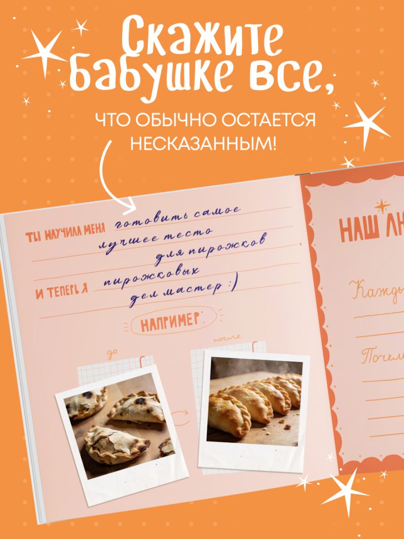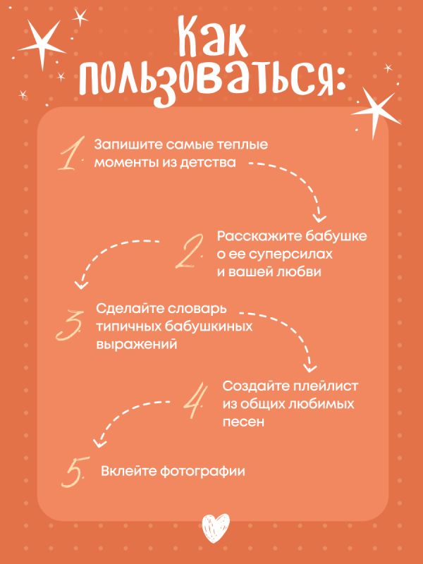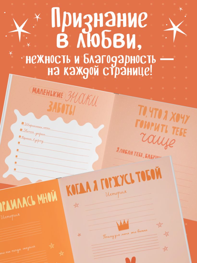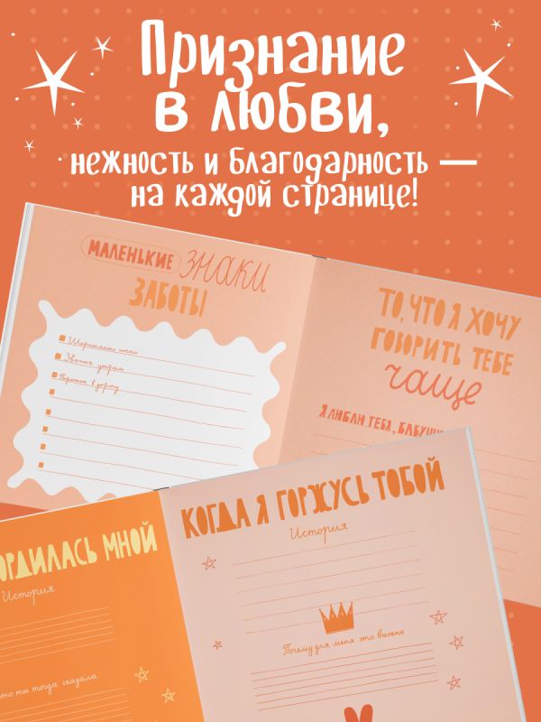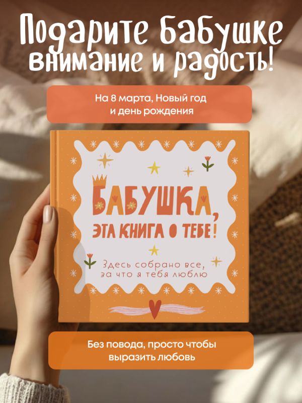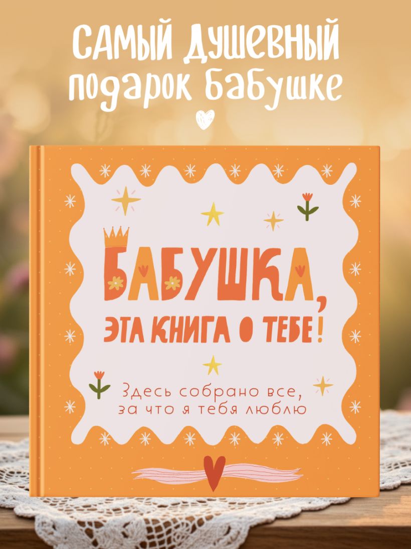В этой книге — бабушкина жизнь с ее вкусами, звуками, адресами, делами и заботой. Вы сами заполняете страницы — от воспоминаний до маленьких «секретов гостеприимства». Это подарок, который объединяет поколения и сохраняет атмосферу дома. Здесь можно записать историю любви бабушки и дедушки, вспомнить любимые сказки, колыбельные, праздники, отметить адреса городов, где бабушка жила и работала. Вы сохраните рецепты пирогов и варенья, рисунок любимого платочка, узор из ее рукоделия, список песен с пластинок и радиопередач. Книга включает купоны заботы и задания, чтобы сделать ее вместе.