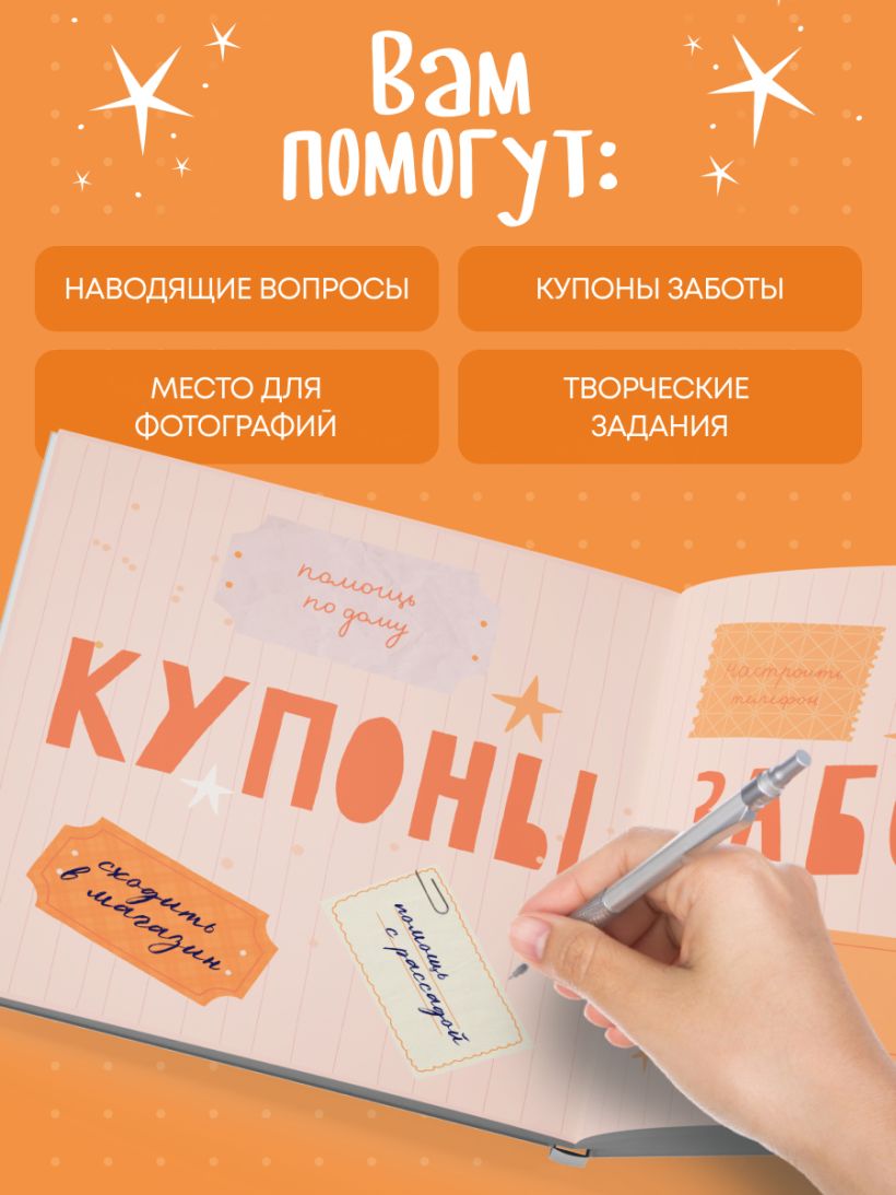 Самый теплый и личный подарок для вашей мамы! Это не просто книга — это место для вашей общей истории. Здесь нет готового текста, потому что главная героиня — ваша мама, а автор — вы. На 64 страницах — вопросы, творческие задания и уютные развороты, которые помогут рассказать ей все, что обычно остается несказанным. Вы расскажете маме, за что ее любите, какие у нее «суперсилы», какие воспоминания самые теплые. Вставите ваши любимые фотографии, вспомните смешные истории и шутки, опишете традиции, рецепты, песни и мечты. Письма, признания, фотографии «тогда и сейчас» — все это станет дорогим сердцу напоминанием о близости и поддержке. Книга будет жить и меняться, потому что ее можно дополнять и после вручения. Что внутри: - Письмо маме на целый разворот, «три слова о тебе», «мамины суперсилы». - Любимые ритуалы, фирменное блюдо и тайный ингредиент из детства. - Словарь маминых выражений, запахи дома, смешные истории. - Фото-страницы «тогда/сейчас», «колесо заботы», «топ‑5 про тебя». - Разделы «Спасибо за...», «Когда мне грустно...», «То, что я хочу говорить чаще». - Письмо в будущее маме и письмо от нее вам. - Купоны заботы, мини‑викторина, наши маленькие победы, Венн‑диаграмма «мы похожи/мы разные». Как пользоваться: 1. Выберите вечер или несколько комфортных моментов, чтобы заполнить книгу. 2. Возьмите фотографии, ручку, маркеры, при желании — наклейки, билеты, открытки. 3. Отвечайте на вопросы честно и просто — не «как правильно», а «как по‑настоящему». 4. Вставьте фото, напишите воспоминания, оставьте даты. 5. Дополните книгу своими рисунками или заметками. Эта книга поможет без суеты, но очень искренне сказать маме главное: «люблю» и «спасибо». Она превратится в семейную реликвию, которую захочется перечитывать годами, а заполнение станет теплым моментом, который вы разделите даже на расстоянии. Подойдет для любого возраста и любого повода: день рождения, День матери, 8 марта, Новый год, юбилей. Это подарок‑воспоминание, который можно вручить от одного ребенка, всей семьи или даже от нескольких поколений.