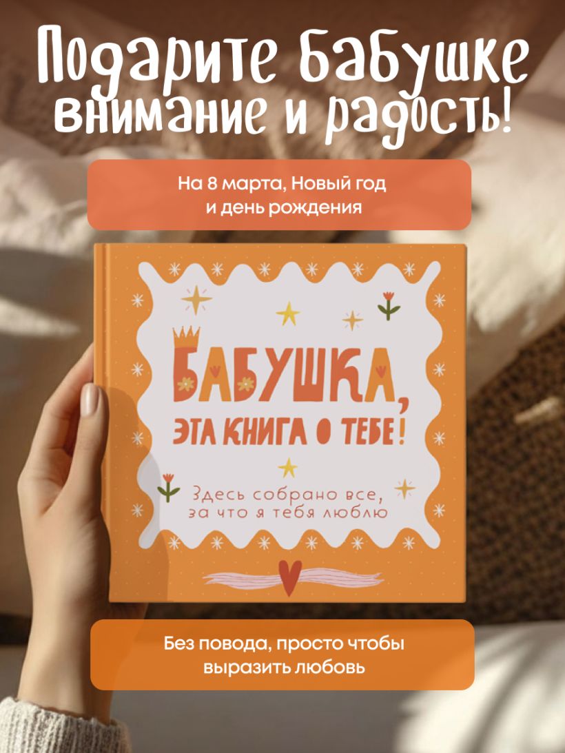 Такой подарок покажет бабушке, что ее жизнь, любовь и мудрость ценны и любимы. Он бережно сохранит семейные воспоминания, станет маленькой хроникой, которую можно дополнить и передать дальше, объединяя всю семью вокруг теплых историй. Подойдет любого возраста дарителя и любого праздника: день рождения бабушки, юбилей, Новый год, День бабушек и дедушек. Можно подарить от одного внука, всей семьи или от нескольких поколений.
