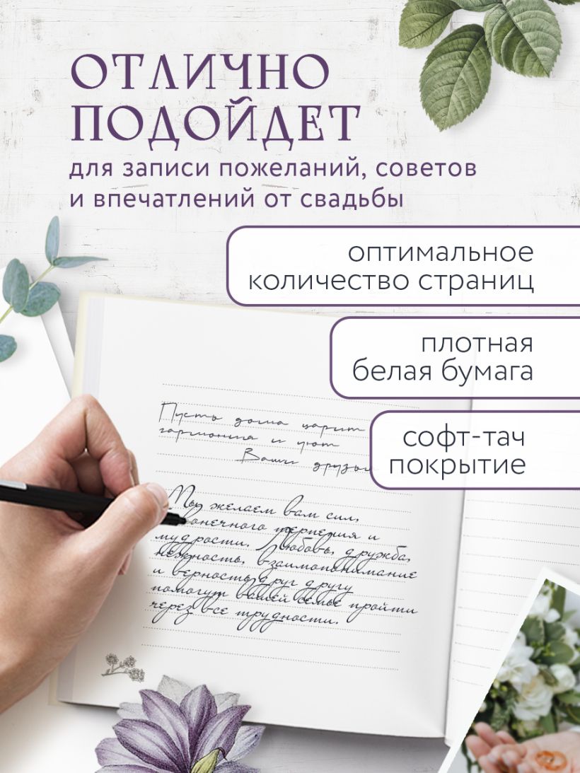 Обложка имеет покрытие софт-тач, что придает блокноту особенный тактильный эффект. При этом нарисованные цветы блестят за счет глянцевого лака. Объем книги пожеланий достаточен для большого количества гостей, а плотные листы разлинованы и крепко сшиты.