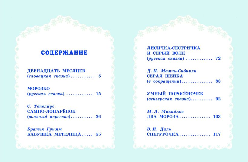 В книгу вошли сказки «Двенадцать месяцев», «Морозко», «Сампо-Лопарёнок» (в пересказе), «Бабушка Метелица», «Лисичка-сестричка и серый волк», «Серая Шейка» (в сокращении), «Умный поросёночек», «Два Мороза», «Снегурочка».