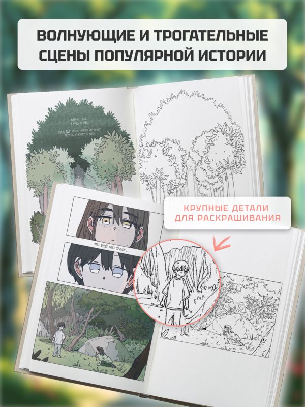 Раскрашивая трогательные сцены — первую встречу Дама и Миши, путешествие Дама и его спутников за пределы родного дома, прощание с друзьями — вы сможете по-новому прочувствовать эмоции героев. Для удобства на левой странице размещён оригинал кадра из вебтуна, который поможет подобрать цвета и передать атмосферу.