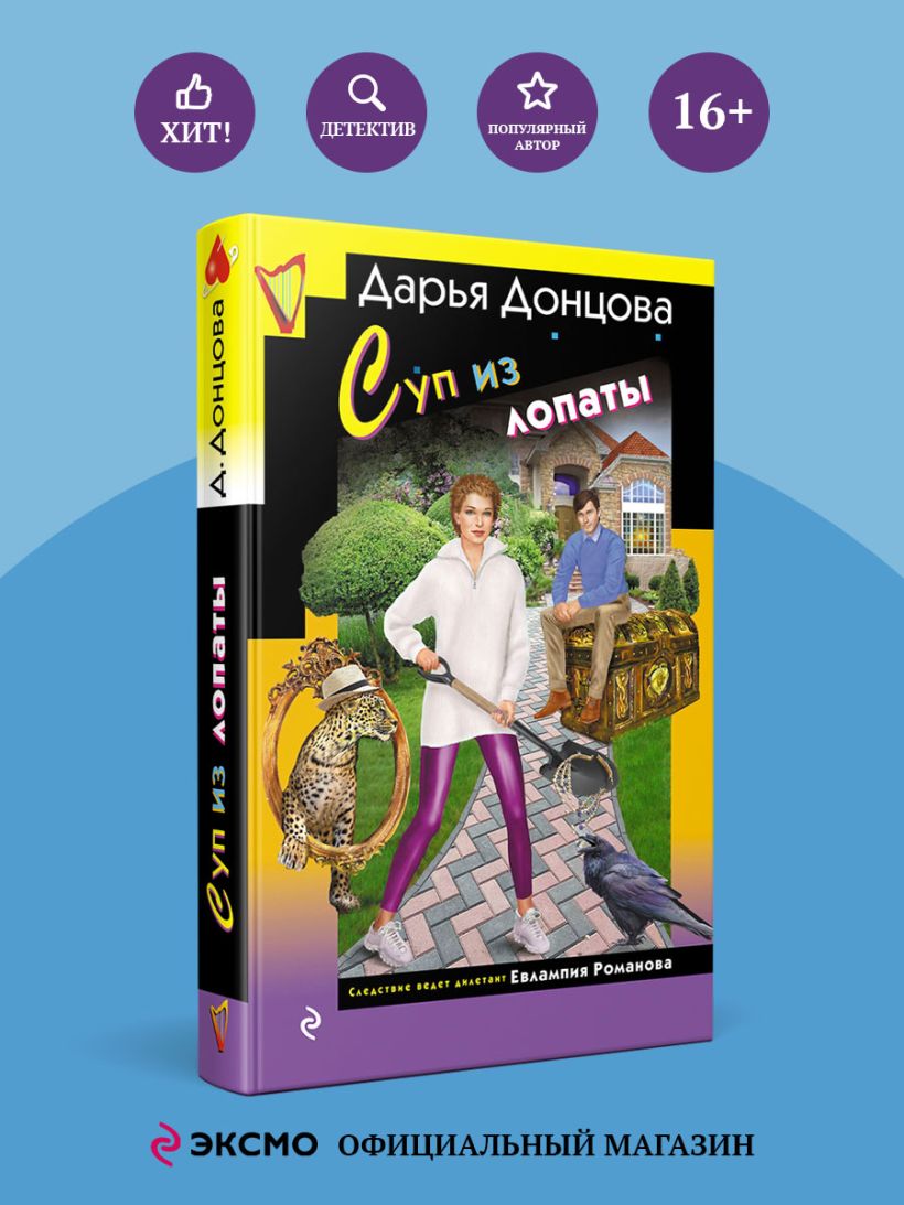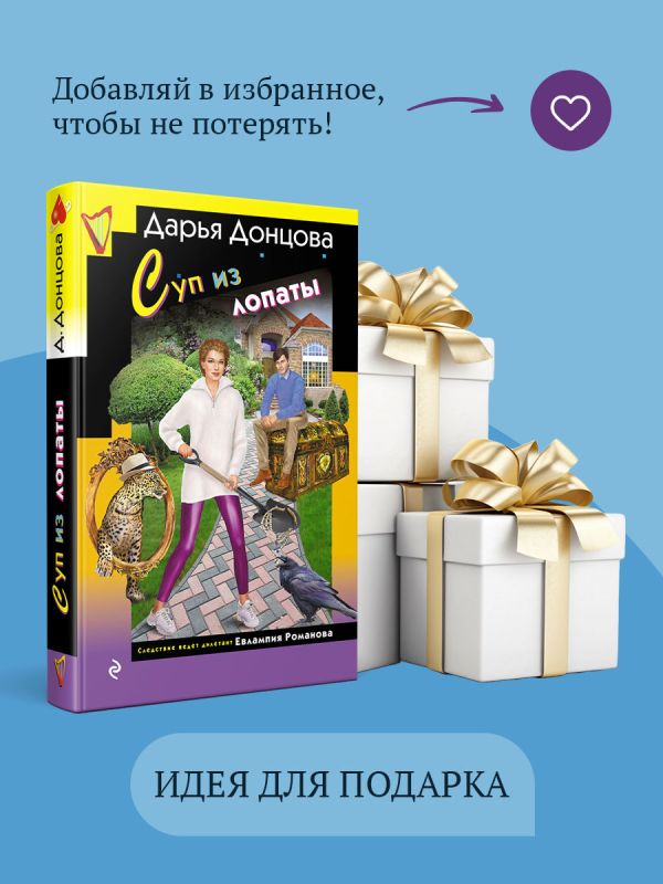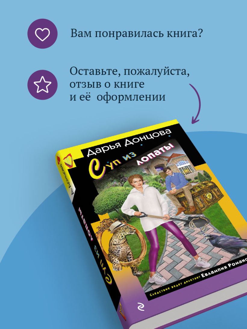 «Суп из лопаты» Если ты кому-то помог, то постарайся побыстрее удрать от карающего меча благодарности. Евлампии Романовой порой кажется, что она живет в палатке на вершине вулкана и постоянно оказывается в потоке лавы. Вот и сейчас к ее подруге-соседке неожиданно приехала свекровь, которую невестка знать не знает, а сын не видел много лет. Лампа решает помочь Гортензии более чем оригинальным образом, и дома у Романовой теперь полный кавардак. Но у судьбы на Лампу другие планы: на работе возникло крайне запутанное дело. В агентство Вульфа обратился Василий Светов и попросил найти своего друга — бизнесмена Сергея Акулова, который вроде бы умер, а вроде бы и нет… «Вишенка на кактусе» Степанида Козлова, звезда мира моды и человек-оркестр с дипломом по перевоплощению унылых клуш в блистательных королев, всегда знала: клиентов много, но настоящих подруг — раз, два и обчелся. И вот ее соседка, красивая, умная и богато упакованная Лиза Максимова, вдруг заявляет: «Мне нужен гипнотизер! Пусть вытрет из моей головы память о том, что я узнала». Одна встреча в кондитерской со странной дамой превратила ее жизнь в мексиканский сериал с элементами триллера. Оказывается, родители ей вовсе не родители, а сестра — хозяйка сети магазинов для животных «Лапы и хвост». Лиза хотела всего лишь мужа и детей, а получила тайну роддома, акушерок с темным прошлым и внезапную сестру, которая завела разговор о ведьмах и проклятиях. К счастью, рядом всегда есть Степанида Козлова — ведь только она умеет раскладывать по полочкам запутанное, как шампунь и бальзам в салоне красоты. Главное — не перепутать, где правда, а где просто хорошо сделанная укладка. «Бумеранг с автопилотом» Татьяна Сергеева давно поняла простую истину: худеющие люди опасны. Особенно если они не просто худеют, а превращают процесс в культ. В ее доме поселилась Варвара Ришелье — нутрициолог, флорист, грумер, маникюрша и стилист в одном лице. Варя с фанатизмом взялась за Танино здоровье, заставив несчастную завтракать серой гречкой без масла и творожком, который по консистенции напоминал строительную шпаклевку. Но вскоре выяснилось, что гречка без соли — не самое страшное в жизни Татьяны. В особняке влиятельных Зотовых загадочно исчез управляющий — человек, который был не только финансистом и администратором, а почти членом семьи. Все уверены, что он просто решил отдохнуть, но только не горничная Соня, выросшая в детдоме и привыкшая ощущать беду кожей. Она готова заплатить любые деньги, лишь бы Сергеева начала поиски. Татьяне придется забыть о голодной диете, ведь на кону — жизнь человека, а возможно, и ее собственная. Дарья Донцова — самый популярный и востребованный автор в нашей стране, любимица миллионов читателей. В России продано более 200 миллионов экземпляров ее книг. Ее творчество наполняет сердца и души светом, оптимизмом, радостью, уверенностью в завтрашнем дне! «Донцова невероятная работяга! Я не знаю ни одного другого писателя, который столько работал бы. Я отношусь к ней с уважением, как к образцу писательского трудолюбия. Женщины нуждаются в психологической поддержке и получают ее от Донцовой. Я и сама в свое время прочла несколько романов Донцовой. Ее читают очень разные люди. И очень занятые бизнес-леди, чтобы на время выключить голову, и домохозяйки, у которых есть перерыв 15—20 