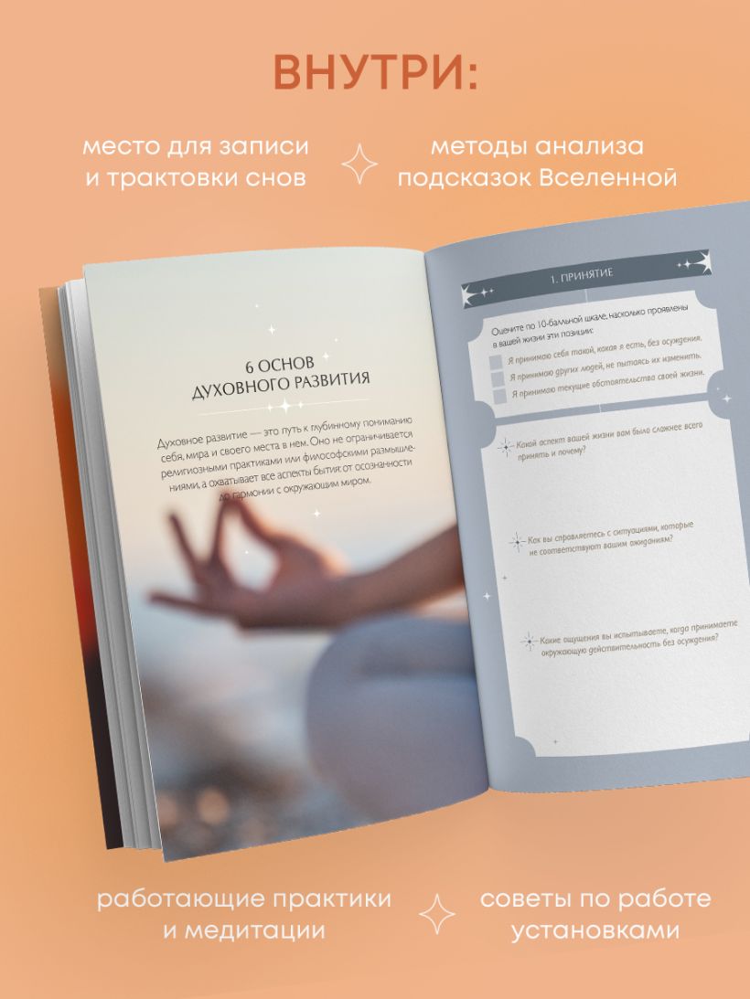 - Практики и ритуалы — медитации, вопросы для дневника, телесные упражнения.
