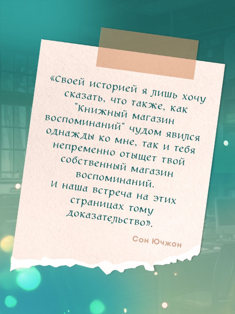 «Своей историей я хотела бы выразить искреннее сочувствие утрате, которая может постичь любого из нас, и протянуть руку дружбы, теплую, как температура человеческого тела. Я лишь хочу сказать, что также, как "Книжный магазин воспоминаний" чудом явился однажды к ничего из себя не представляющей мне, так и тебя непременно отыщет твой собственный магазин воспоминаний. И наша встреча на этих страницах тому доказательство». — Сон Ючжон