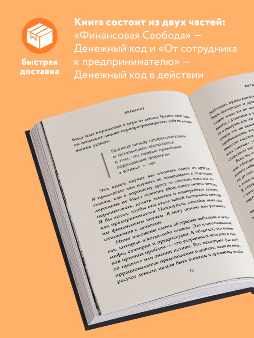 Книга состоит из двух частей: «Финансовая Свобода» — Денежный код и «От сотрудника к предпринимателю» — Денежный код в действии. В первой части основное внимание уделяется образу мышления, во второй — способностям.