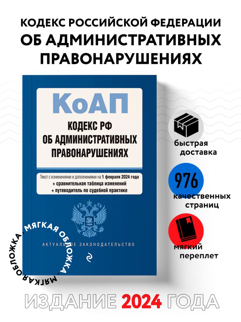 Кодекс Российской Федерации об административных правонарушениях с изменениями и дополнениями на 1 февраля 2024 года с удобной навигацией по судебной практике и таблицей изменений. Если есть изменения, вступающие в силу позднее, то вместе с редакцией нормы, действующей на эту дату, приводится норма в новой редакции и указывается дата, с которой она вступает в силу.