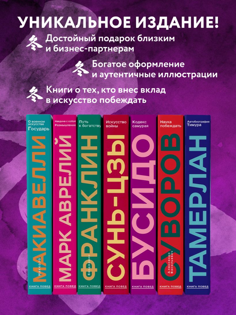 «Книга побед» — коллекционная серия подарочных иллюстрированных книг, объединившая фигуры легендарных исторических личностей, которые внесли каждый свой вклад в искусство побеждать. Издания, вошедшие в серию, посвящены не только премудростям военной науки, тактике, стратегии, но и воспитанию духа, воли и качеств настоящего лидера, необходимых для победы. Собеседниками и учителями выступают легендарные полководцы, мыслители, государственные деятели.