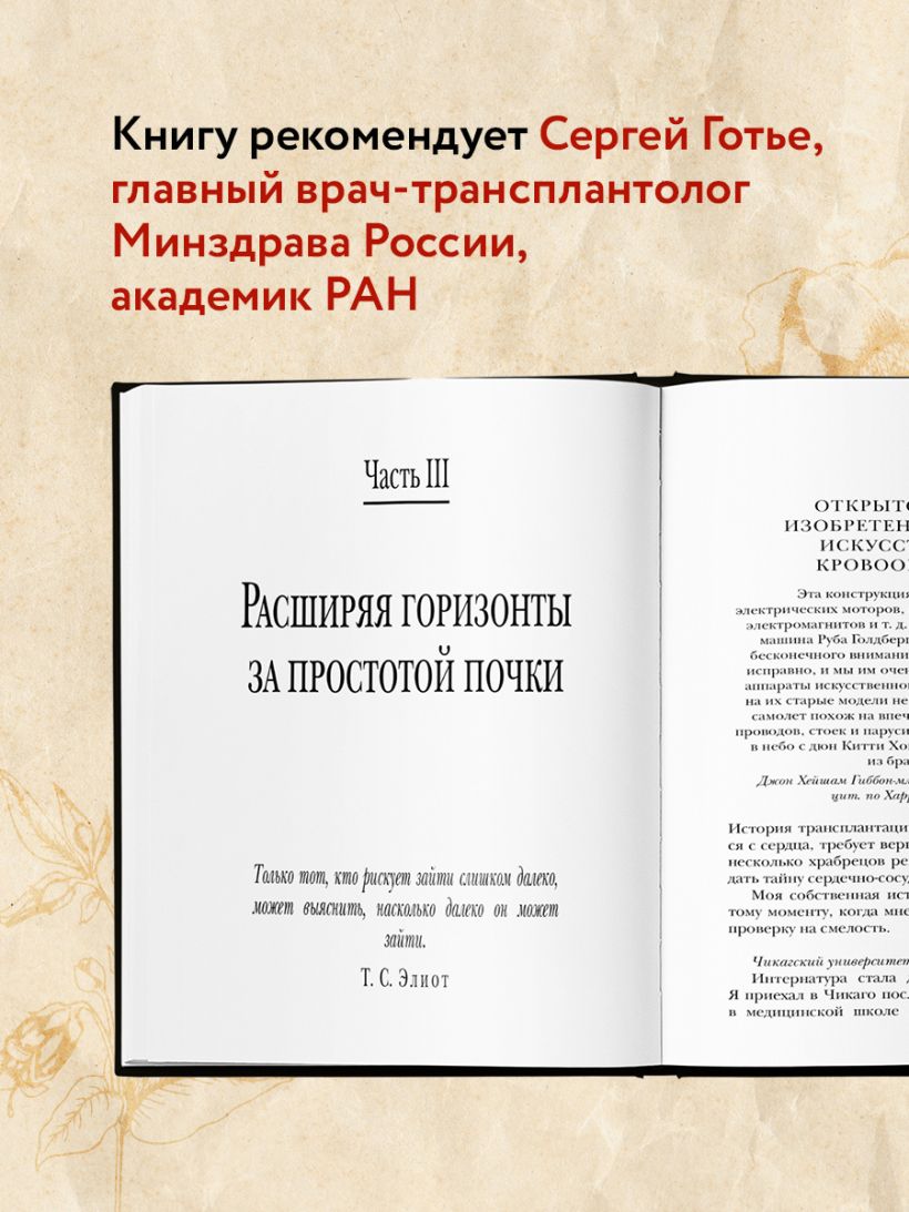 «В книге врача Джошуа Мезрича тесно сплетены мысли и чувства хирурга с историческими фактами развития мировой трансплантологии. Эта жизненная история позволяет лучше понять и осознать читателям путь становления хирурга-трансплантолога». — Сергей Готье, академик РАН, директор «НМИЦ ТИО им. ак. В. И. Шумакова» Минздрава России, главный специалист-трансплантолог Минздрава России