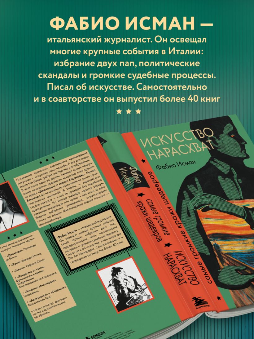 К счастью, значительная часть похищенного возвращается своим владельцам. И происходит это благодаря тому, что к делу подключаются арт-карабинеры. Такой отдел полиции, расследующий исключительно преступления, связанные с предметами искусства, существует только в Италии — стране, где их кражи регистрируются каждый день. Фабио Исман — журналист, много лет освещавший громкие события Италии и писавший об искусстве, — лично знаком со многими арт-карабинерами и как никто другой осведомлен о самых интересных случаях в их работе.