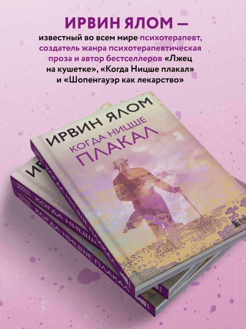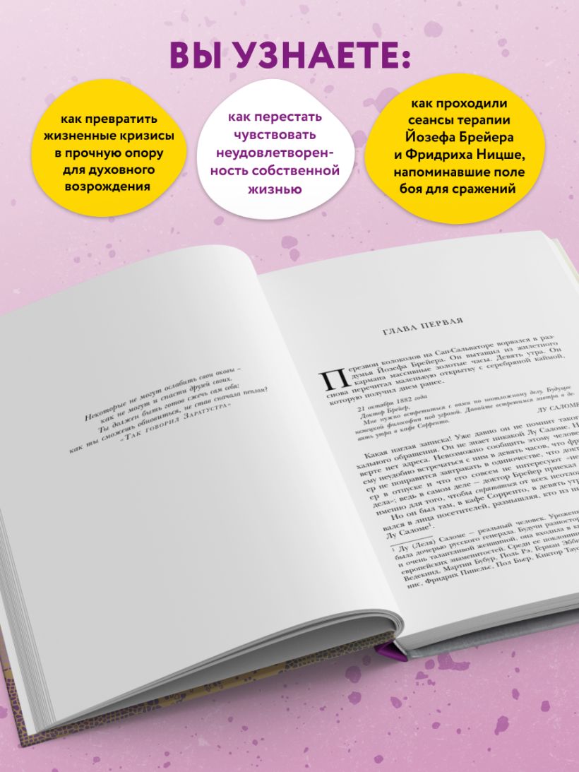 Одна из лучших книг Ирвина Ялома. Факты и вымысел, страсть и отвращение, обязательства и свобода - драматические события разворачиваются на фоне интеллектуального брожения Вены XIX века, в преддверии зарождения психоанализа. Незаурядный пациент… Талантливый врач, терзаемый мучениями… Тайный договор. Соединение этих элементов порождает незабываемую сагу о будто бы имевших место взаимоотношений величайшего философа Европы (Фридриха Ницше) и одного из отцов-основателей психоанализа (Йозефа Брейера). Ялом втягивает в действие не только Ницше и Брейера, но и русскую красавицу Лу Саломе, одну из пациенток Брейера "Анну О." и молодого медика-интерна Зигмунда Фрейда, создав интеллектуальный роман с захватывающим сюжетом.