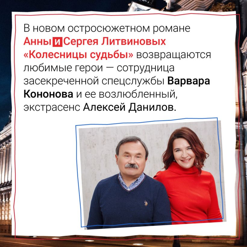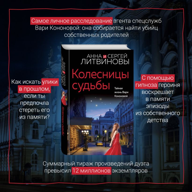 В новом остросюжетном романе Анны и Сергея Литвиновых «Колесницы судьбы» возвращаются любимые герои — сотрудница засекреченной спецслужбы Варвара Кононова и ее возлюбленный, экстрасенс Алексей Данилов. Варе придется заглянуть в прошлое, чтобы узнать много нового о себе и своей семье…