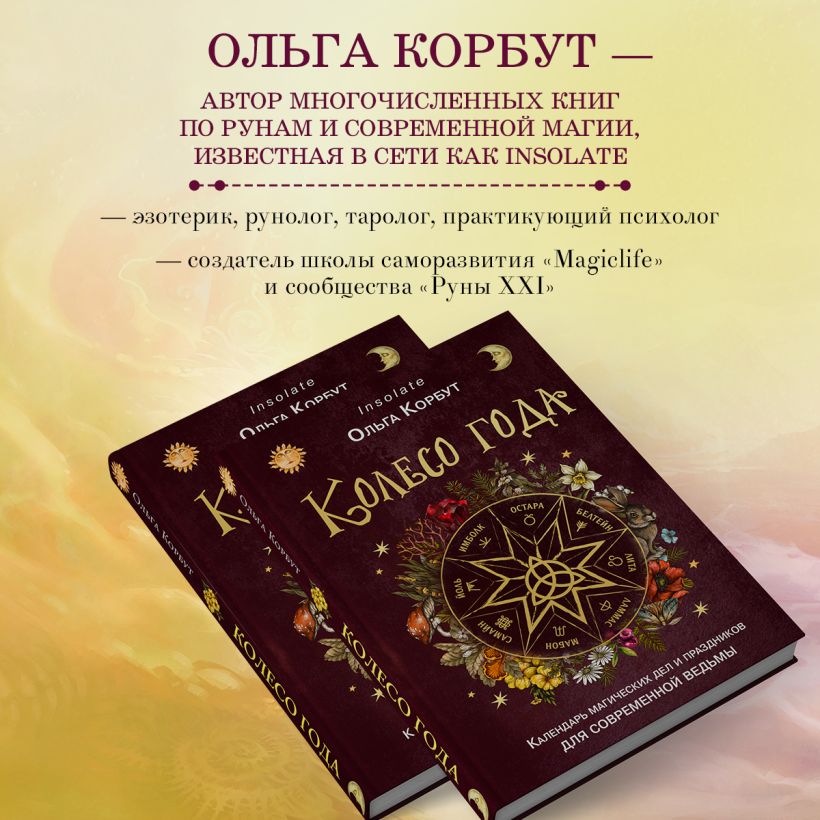 Ольга Корбут, также известная в Сети как Insolate, — эзотерик, рунолог, таролог, практикующий психолог. Создатель школы саморазвития «Мagiclife» и сообщества «Руны XXI», автор книг «Руны. Теория и практика работы с древними силами», «Магия рун. Практическое руководство по созданию и использованию рунических формул», Магия стихий. Как использовать силы природы, чтобы получить поддержку и защиту», «Сила луны. Как использовать лунную энергию в магической работе», «Магия защиты. Как уберечь себя и своих близких от злых сил и негативного колдовства», ведущая обучающих курсов и семинаров по рунам, Таро и практической магии.