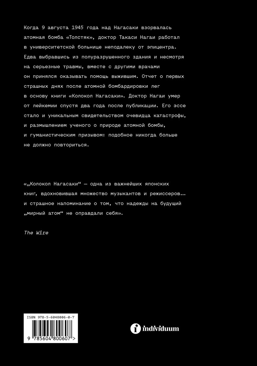 Когда 9 августа 1945 года над Нагасаки взорвалась атомная бомба «Толстяк», доктор Такаси Нагаи работал в университетской больнице неподалеку от эпицентра. Едва выбравшись из полуразрушенного здания и несмотря на серьезные травмы, вместе с другими врачами он принялся оказывать помощь выжившим. Отчет о первых страшных днях после атомной бомбардировки лег в основу книги «Колокол Нагасаки».