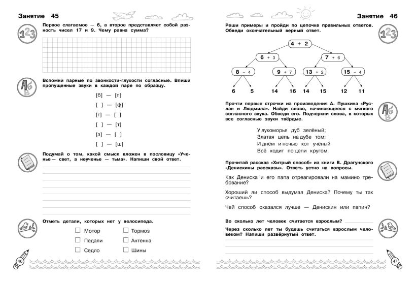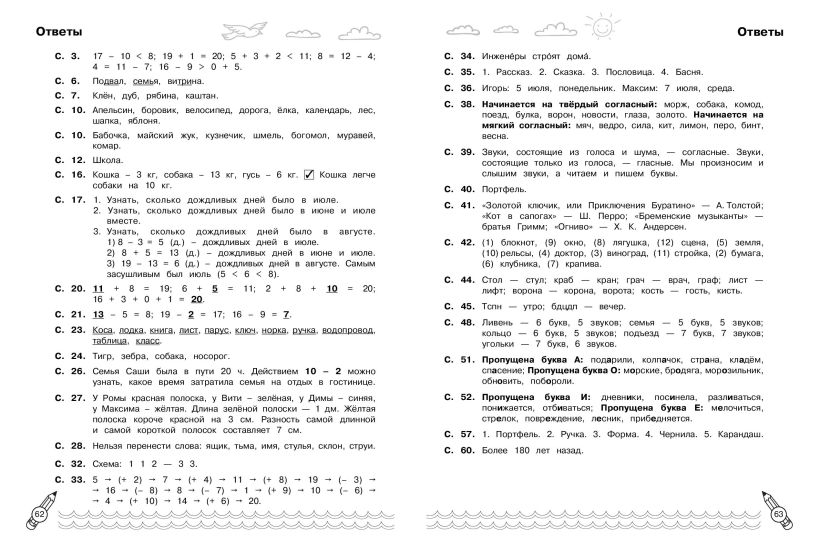 Тренажёр для учеников начальной школы подготовлен для повторения и закрепления всего пройденного материала за курс 1 класса. Пособие состоит из 60 занятий, каждое из которых включает в себя задания по математике, русскому языку, литературному чтению и окружающему миру. В день надо выполнить одно занятие, в котором комплексно представлены задания сразу по четырём основным предметам. Они отмечены соответствующими значками. Это очень удобно — ученик переключается с одного упражнения на другое, повторяет все предметы, но при этом не теряет интереса к занятиям из-за их разнообразия. Ежедневное повторение поможет ребёнку не только отработать навыки и закрепить знания, полученные в 1 классе, но и подготовить будущего второклассника к следующему учебному году. Ответы, приведённые в конце тренажёра, предоставлены для родителей, которым они помогут сэкономить время на проверку выполненного ребёнком задания.