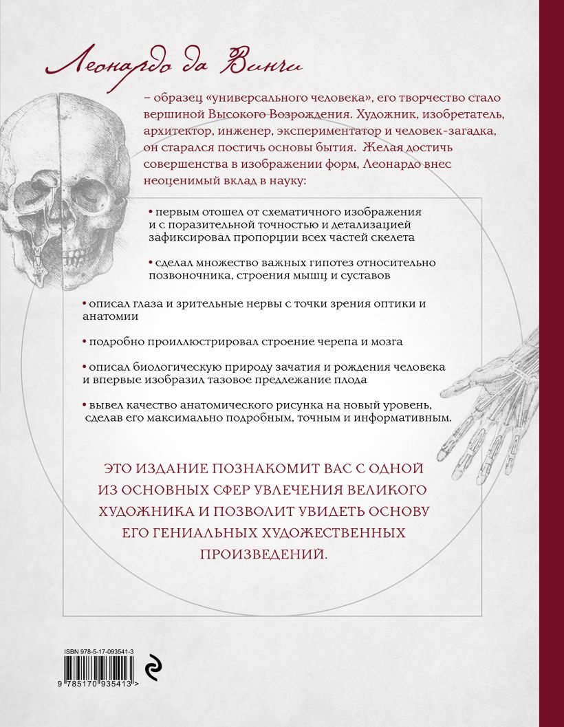 Леонардо хотел изучить все возможные аспекты природы человека: от структурной анатомии до способов самовыражения, и в процессе создал одно из самых совершенных анатомических исследований своего времени. Художник планировал опубликовать свой уникальный трактат, но не успел. Осуществи он свое намерение, и исследования в области анатомии шагнули бы далеко вперед. Но этому не суждено было сбыться — после смерти его эскизы так и остались пылиться среди других бумаг на долгих четыре столетия…