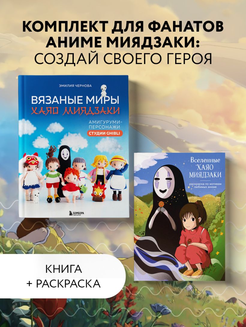 В комплект вошли книга и раскраска: Вязаные миры Хаяо Миядзаки. Амигуруми-персонажи студии Ghibli + Вселенные Хаяо Миядзаки. Раскраска по мотивам любимых аниме
