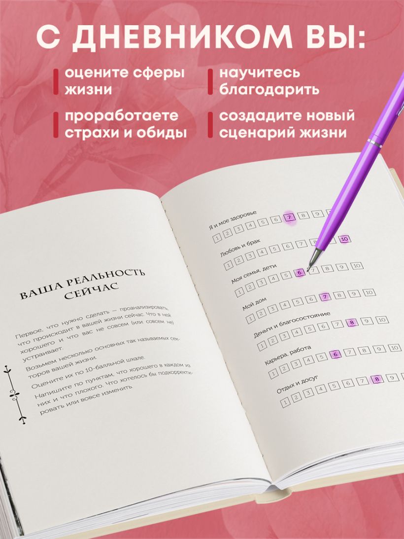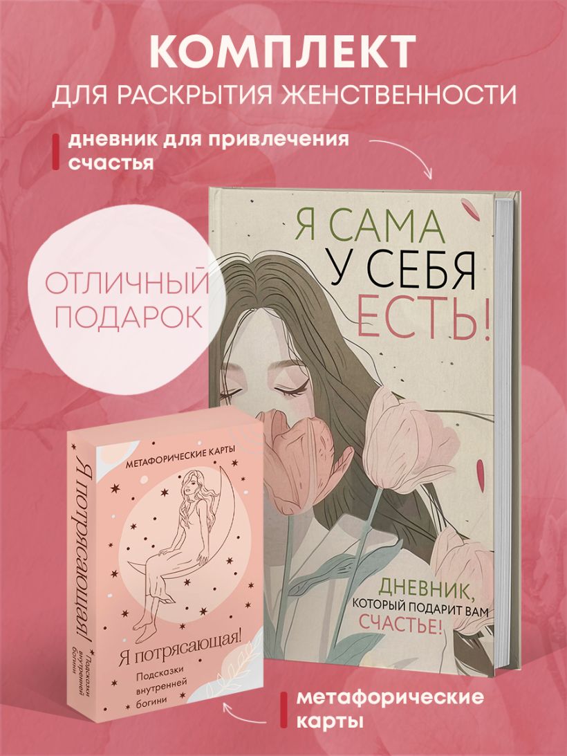 В комплект входит блокнот, который научит вас смотреть с удовольствием на свое отражение в зеркале, слышать и любить себя, создавать вокруг себя ту реальность, которую вы хотите видеть. Вместе с блокнотом вы приобретаете колоду метафорических карт, раскрывающих силу интуиции через ассоциации, чтобы легче находить искомый ответ.