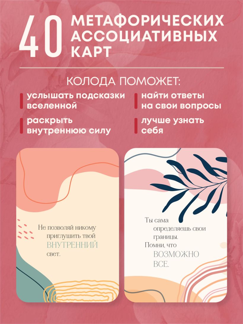 Комплект из блокнота и метафорических карт, которые научат вас ценить себя превыше всего, помогут избавиться от зависимости от чужого мнения, потому что единственное, что важно, – это вы.